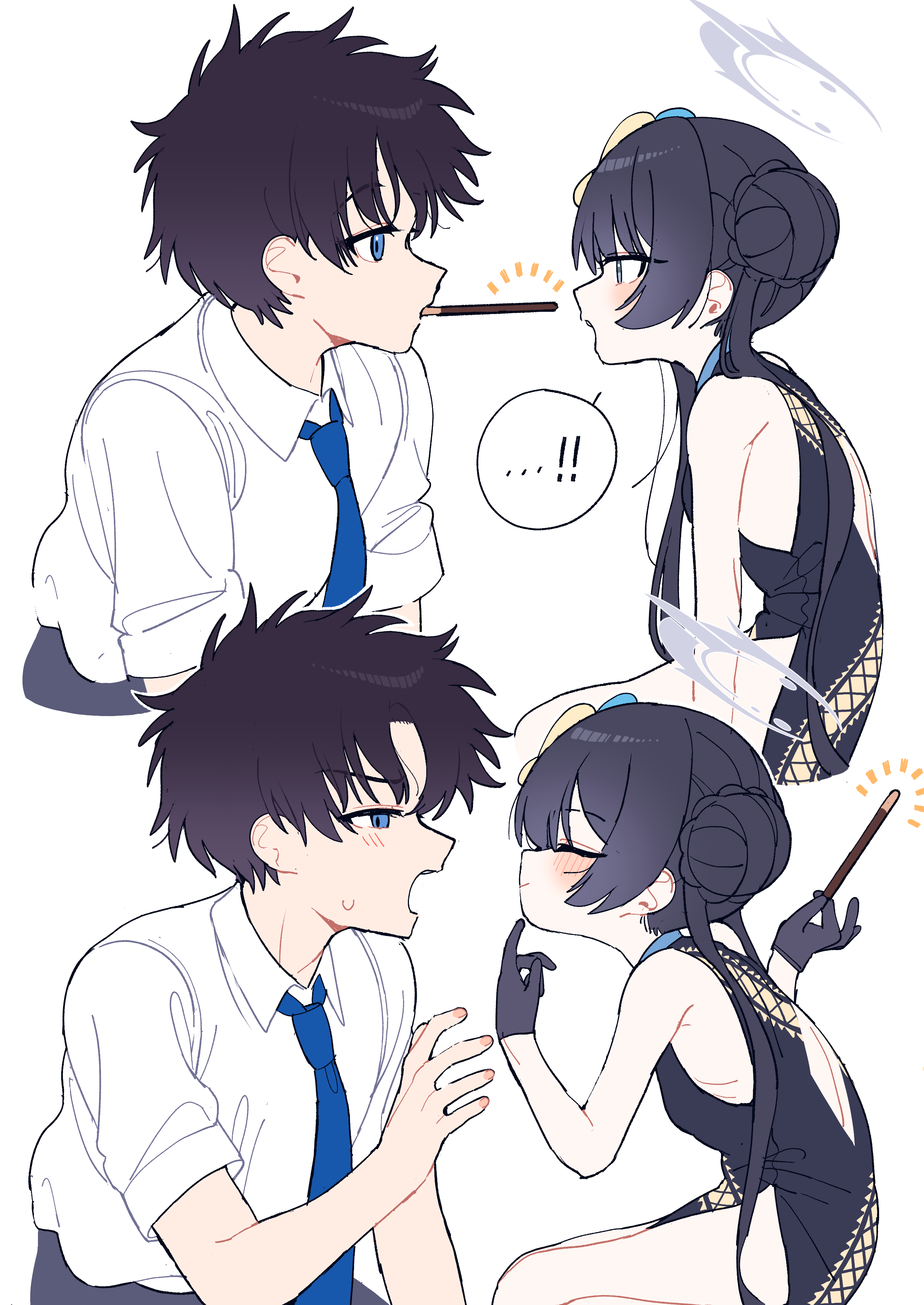 ! !! 1boy 1girl absurdres back_cutout bare_shoulders black_dress black_gloves black_hair blue_archive blue_eyes blue_necktie blush braid braided_bun butterfly_hair_ornament china_dress chinese_clothes clothing_cutout collared_shirt commentary_request couple cropped_legs curtained_hair dragon_print dress food food_in_mouth gloves grey_eyes grey_halo grey_pants hair_bun hair_ornament halo hetero highres je_o_mo kisaki_(blue_archive) long_hair necktie pants parted_bangs pelvic_curtain pocky pocky_in_mouth pocky_kiss pointing_at_mouth print_dress sensei_(blue_archive) shared_food shirt short_hair short_sleeves side_slit sidelocks simple_background sweatdrop twintails white_background white_shirt