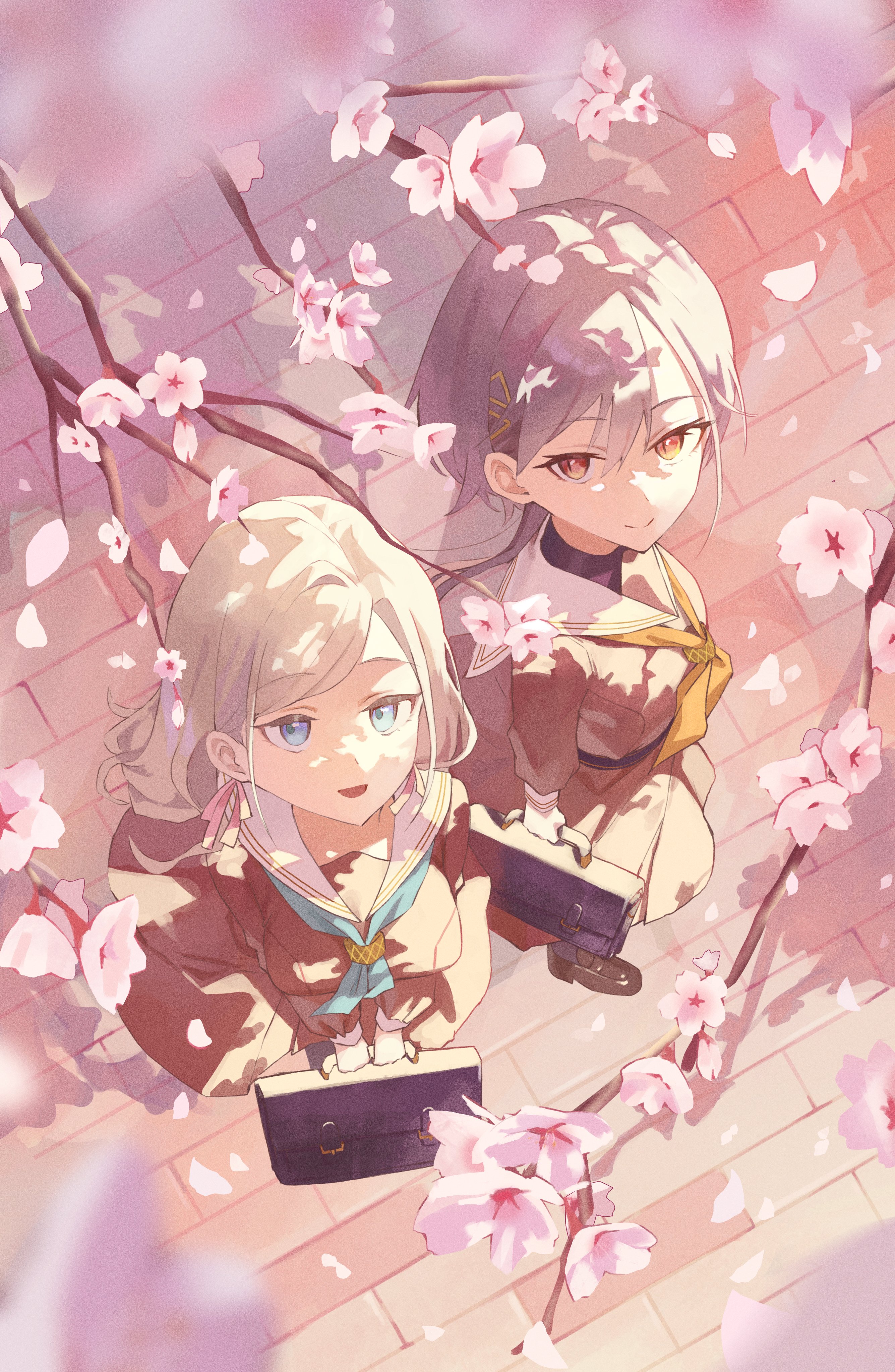 2girls :d absurdres aqua_neckerchief black_pantyhose blue_eyes breasts brick_road briefcase brown_dress brown_shoes ceras_yanagida_lilienfeld cherry_blossoms closed_mouth commentary dress edel_note falling_petals flower from_above grey_hair hasu_no_sora_school_uniform highres holding holding_briefcase katsuragi_izumi large_breasts link!_like!_love_live! loafers long_hair long_sleeves love_live! medium_breasts medium_dress multiple_girls neckerchief open_mouth orange_eyes outdoors pantyhose petals pink_flower pink_petals pleated_dress sailor_collar sailor_dress school_briefcase school_uniform shoes single_hair_intake smile split_mouth spring_(season) standing sunkeun turtleneck virtual_youtuber wavy_hair white_sailor_collar winter_uniform wolf_cut yellow_neckerchief