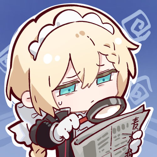 1girl artist_request blonde_hair blue_eyes braid centaureissi_(neural_cloud) chibi chibi_only chinese_commentary furrowed_brow g36_(girls'_frontline) girls'_frontline girls'_frontline_neural_cloud holding holding_magnifying_glass holding_newspaper lowres magnifying_glass maid_headdress newspaper official_art second-party_source solo sticker_(medium) sweatdrop