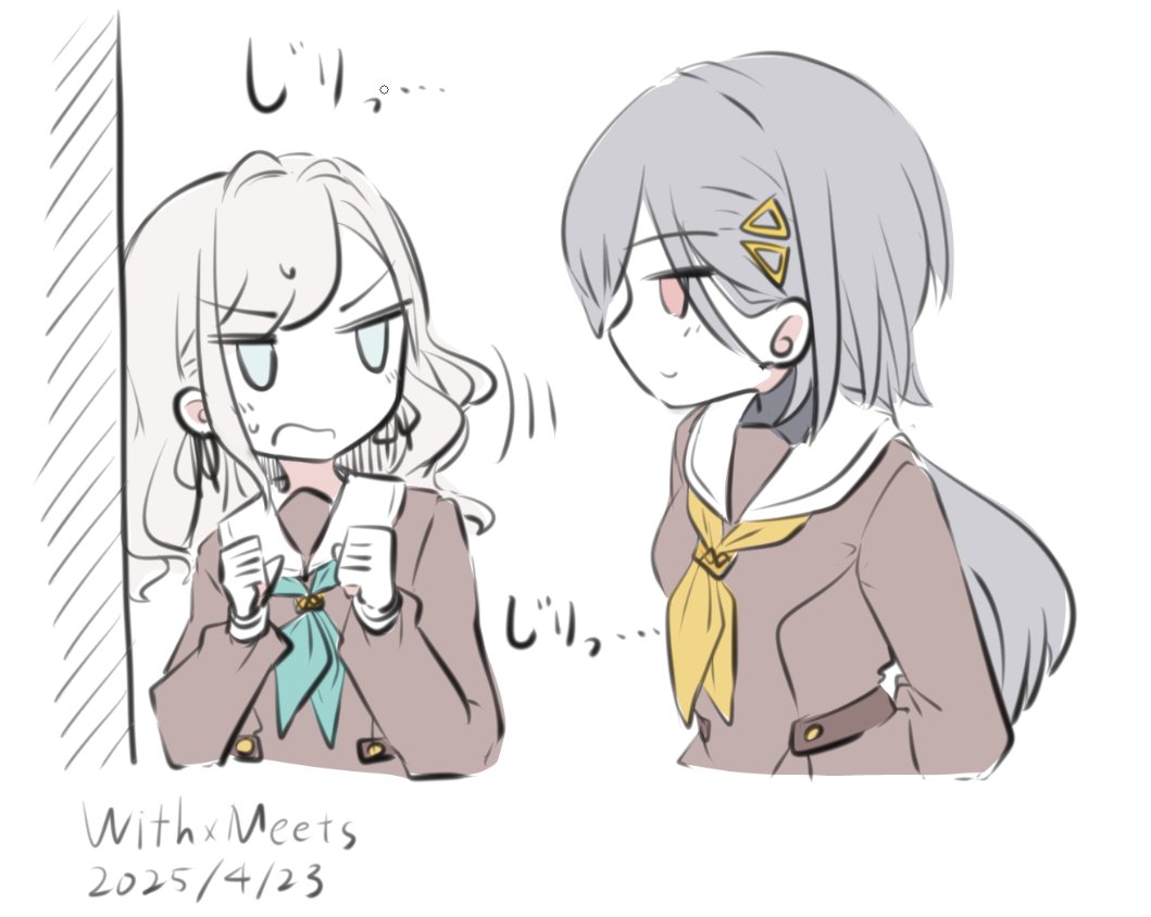 2girls aqua_neckerchief blue_eyes brown_dress ceras_yanagida_lilienfeld commentary_request cropped_torso dated dress edel_note glaring grey_hair hair_ornament hasu_no_sora_school_uniform jitome katsuragi_izumi link!_like!_love_live! long_hair long_sleeves looking_at_another love_live! multiple_girls neckerchief orange_eyes profile sailor_collar sailor_dress school_uniform sidelocks simple_background sio_pasta staring sweat triangle_hair_ornament turtleneck v-shaped_eyebrows virtual_youtuber white_background white_sailor_collar winter_uniform wolf_cut yellow_neckerchief