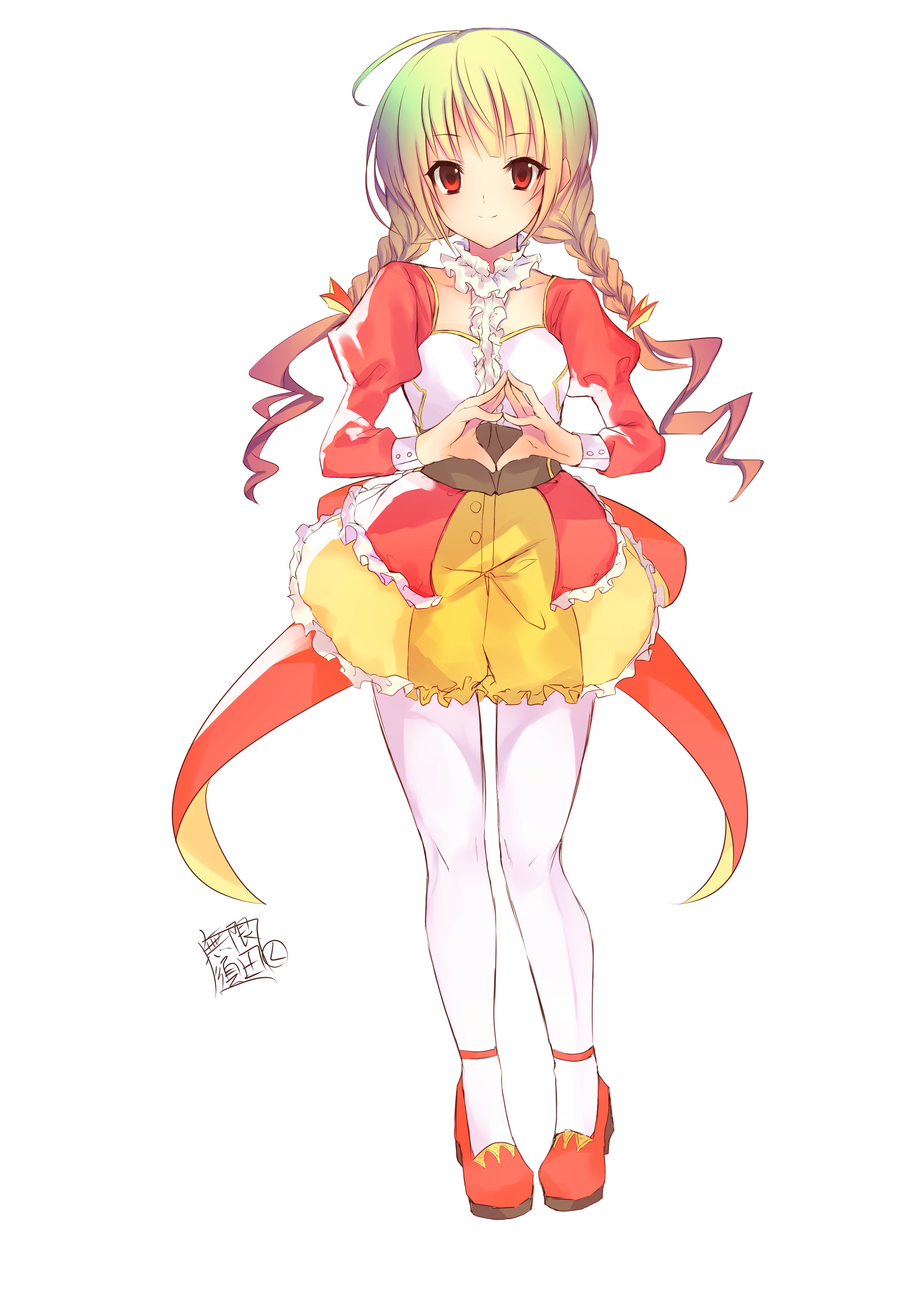 1girl absurdres ahoge blonde_hair braid commentary_request full_body gradient_hair green_hair highres juliet_sleeves long_sleeves low_twin_braids miniskirt mugen_no_sudadokei multicolored_hair orange_hair original pantyhose puffy_sleeves red_eyes red_shoes shirt shoes signature skirt smile solo twin_braids white_pantyhose yellow_shirt