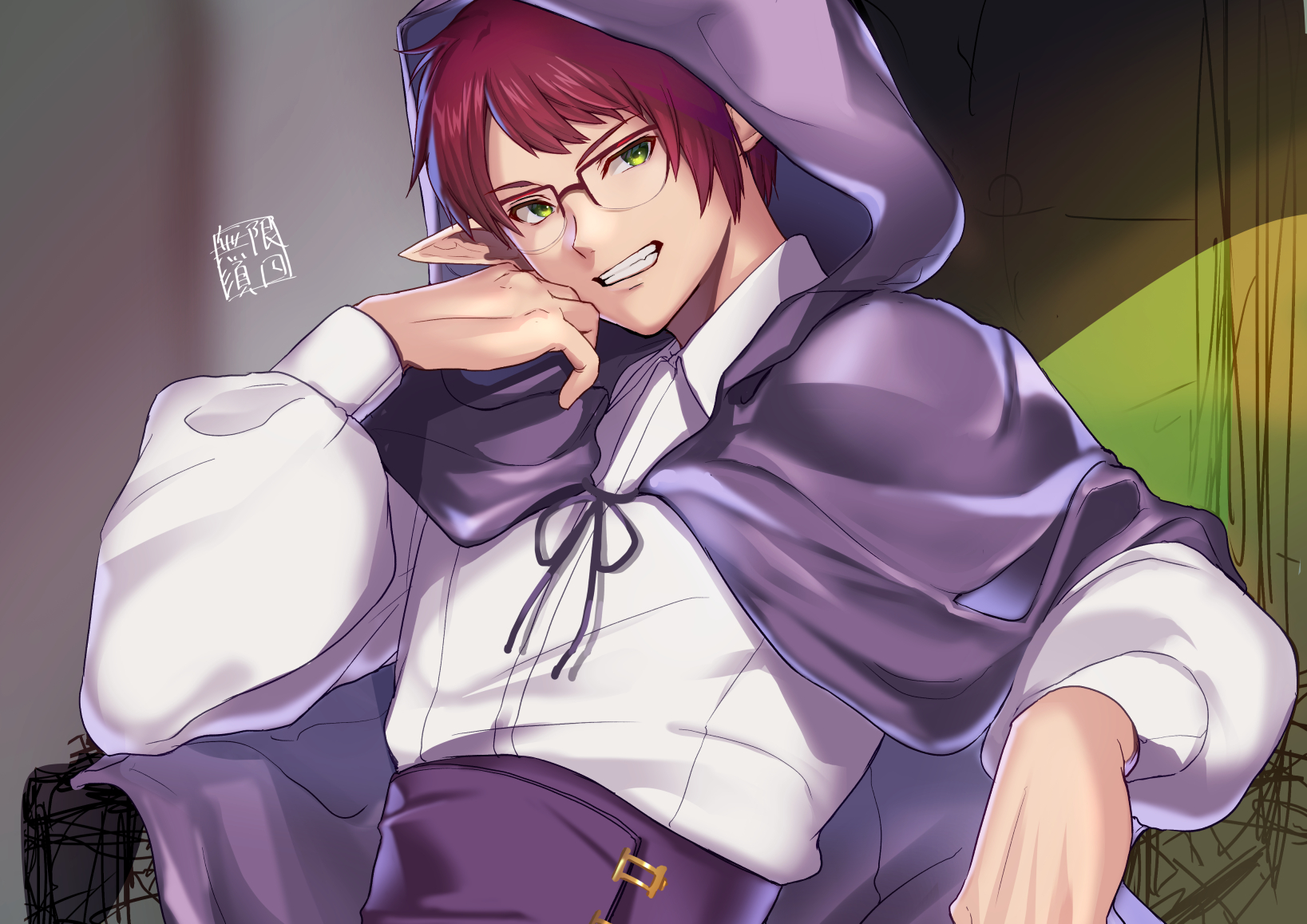 1boy arm_up cloak commentary_request glasses green_eyes grin head_rest highres hood hooded_cloak male_focus mugen_no_sudadokei original over-rim_eyewear pointy_ears purple_cloak red_hair semi-rimless_eyewear signature smile solo throne upper_body