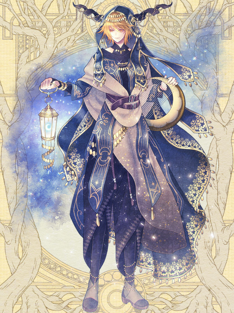 1boy arm_warmers belt belt_buckle black_arm_warmers black_horns black_pants black_pantyhose black_shirt blonde_hair blue_robe blue_veil brown_belt buckle closed_mouth crescent dairoku_ryouhei full_body gold_trim grey_robe grey_sandals hair_between_eyes hair_flaps halterneck head_chain holding holding_instrument holding_lantern horn_ornament horns horns_through_hood instrument jewelry kawa_k3 lantern light_particles long_sleeves looking_to_the_side lyre male_focus multiple_belts nova_formont orange_eyes pants pantyhose robe sandals shirt short_hair smile solo standing veil