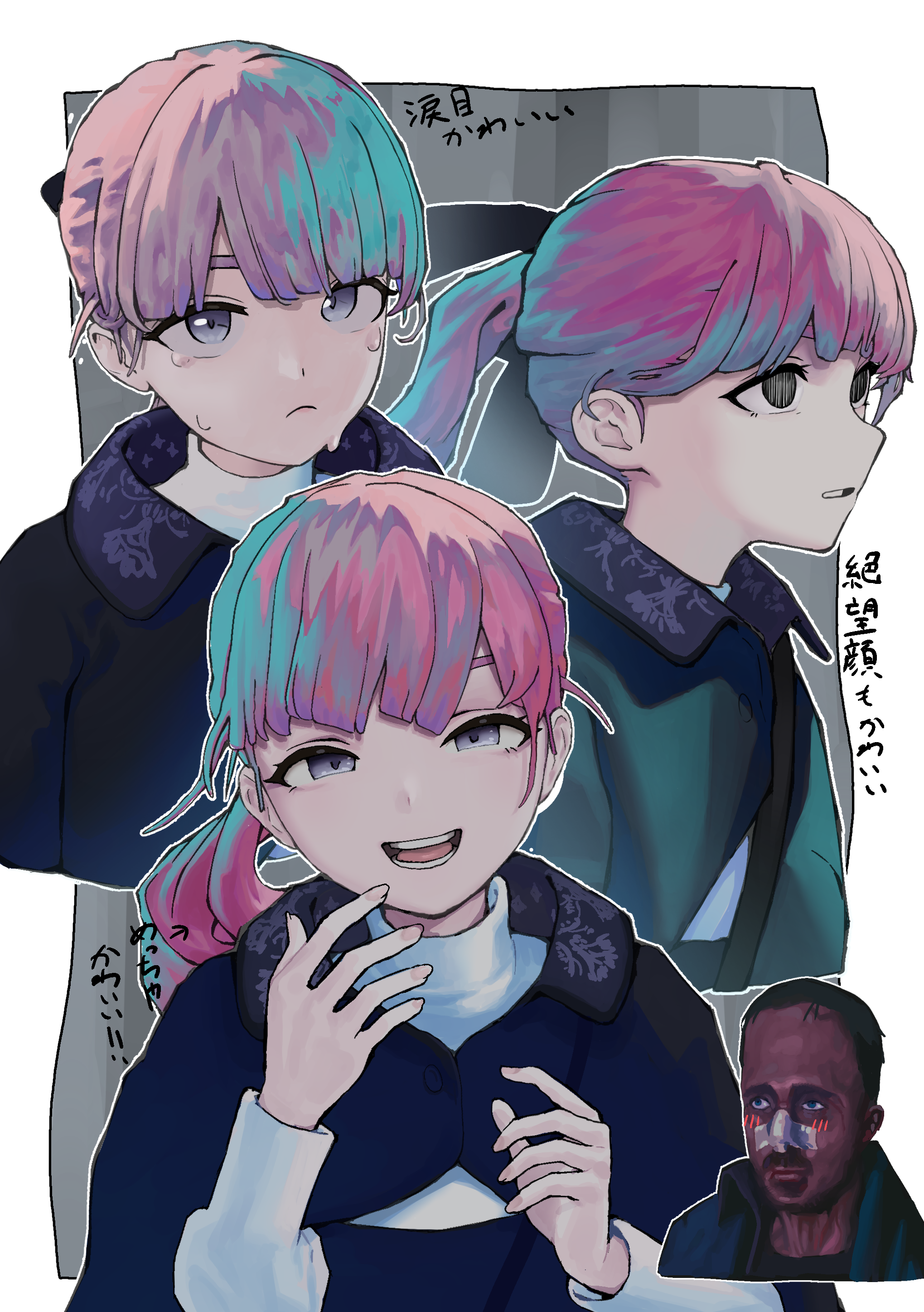 1boy 1girl :d absurdres black_bow black_hair blood blood_on_face blue_capelet border bow capelet closed_mouth cropped_torso crying crying_with_eyes_open dark-skinned_male dark_skin green_jacket grey_background grey_eyes hair_bow hands_up highres jacket lapwing_(vrchat) long_hair long_sleeves looking_at_viewer multicolored_hair multiple_views open_mouth outline outside_border parted_lips pink_hair piropiro0215 ponytail puffy_sleeves purple_eyes purple_hair ryan_gosling shirt smile sweat sweatdrop tears teeth turtleneck upper_body vrchat white_border white_outline white_shirt
