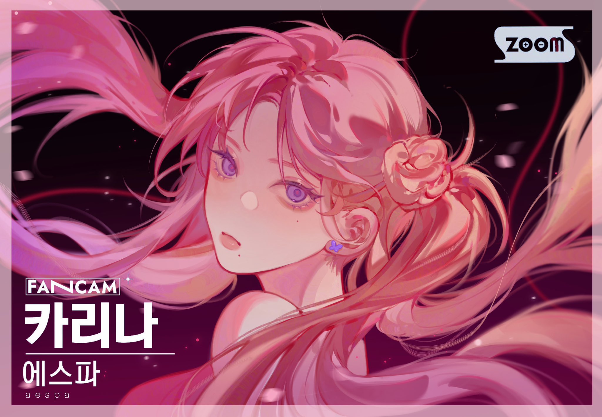 1girl aespa bare_shoulders closed_mouth commentary_request earrings eyeshadow floating_hair highres jewelry k-pop karina_(aespa) looking_at_viewer looking_back makeup mole pink_hair pink_theme purple_eyes real_life solo twintails upper_body yuanwei_shaoya