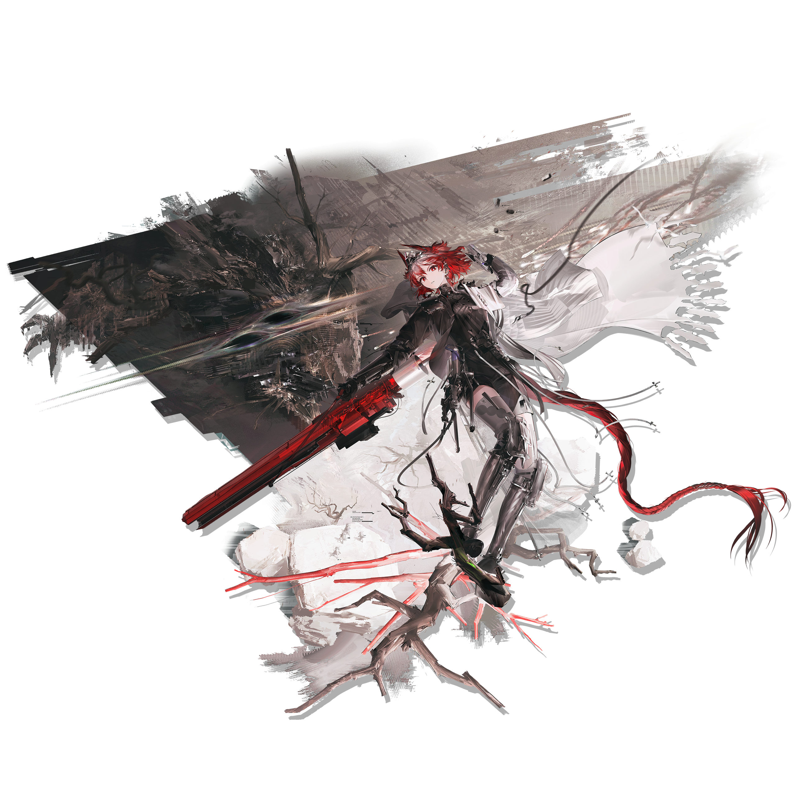 1girl absurdly_long_hair absurdres arknights armor armored_boots asymmetrical_bodysuit asymmetrical_gloves asymmetrical_jacket asymmetrical_legwear bare_tree belt bird_girl black_belt black_bodysuit black_gloves black_jacket bodysuit bodysuit_under_clothes boots braid ear_piercing feather_hair fiammetta_(arknights) fiammetta_(judgment_day)_(arknights) floating_clothes full_body gloves gun highres holding holding_gun holding_weapon jacket long_braid long_hair looking_at_viewer mismatched_gloves mismatched_legwear monster multicolored_jacket official_alternate_costume official_art open_mouth pauldrons piercing poleyn red_eyes red_hair shell_casing shoulder_armor shuiyaoximushi single_braid solo standing standing_on_branch teeth thigh_boots tiara transparent_background tree two-tone_jacket very_long_hair weapon white_gloves white_jacket