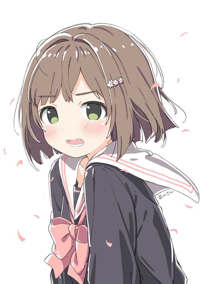 1girl blue_cardigan bow bowtie brown_hair cardigan falling_petals fang flower green_eyes hair_flower hair_ornament idolmaster idolmaster_cinderella_girls kuresuku_(lessons) long_sleeves looking_at_viewer maekawa_miku open_mouth petals pink_bow pink_bowtie pink_petals sailor_collar short_hair solo upper_body white_background white_sailor_collar