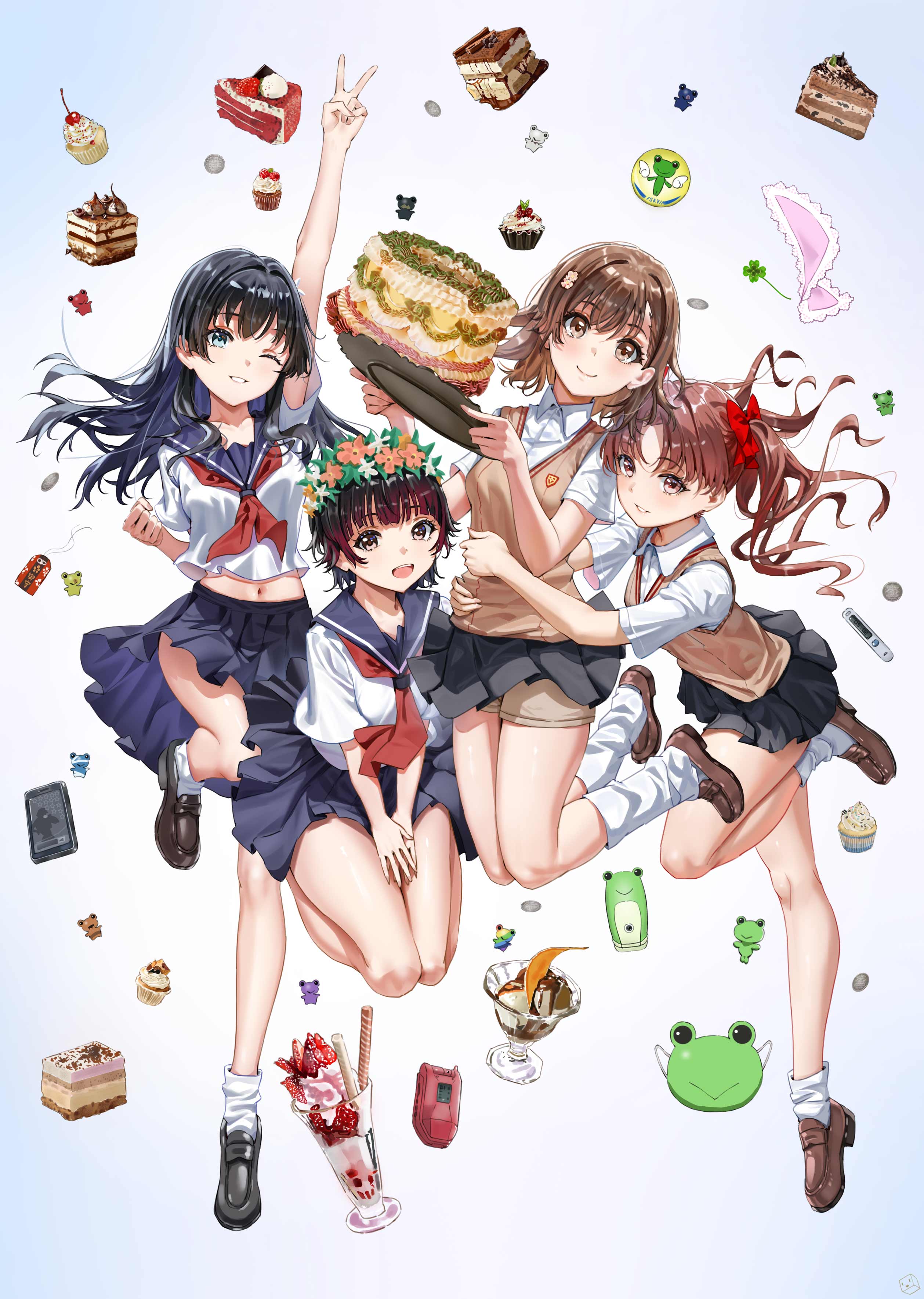 4girls absurdres birthday birthday_cake black_hair black_shoes blue_sailor_collar blue_skirt brown_eyes brown_hair brown_shoes brown_sweater_vest cake collared_shirt flower food gekota grey_skirt hair_flower hair_ornament hairpin head_wreath highres kuuhaku_(pskf2372) loafers long_hair looking_at_viewer loose_socks midriff miniskirt misaka_mikoto multiple_girls neckerchief parfait pleated_skirt red_neckerchief sailor_collar sakugawa_school_uniform saten_ruiko school_emblem school_uniform serafuku shirai_kuroko shirt shoes short_hair short_sleeves skirt smile socks summer_uniform sweater_vest toaru_kagaku_no_railgun toaru_majutsu_no_index tokiwadai_school_uniform twintails uiharu_kazari v v-neck white_background white_shirt white_socks