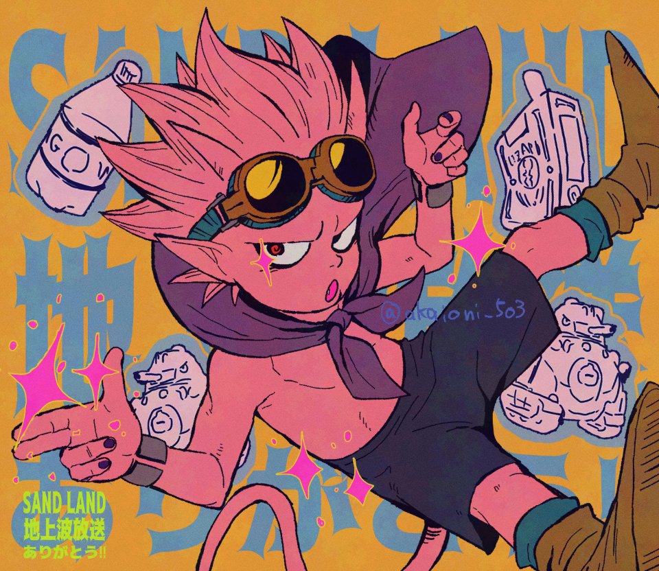 1boy akaioni_503 beelzebub_(sand_land) black_shorts bottle colored_skin copyright_name finger_gun full_body male_focus military_vehicle motor_vehicle no_eyebrows pink_hair pink_skin red_eyes sand_land short_hair shorts solo spiked_hair tank topless_male