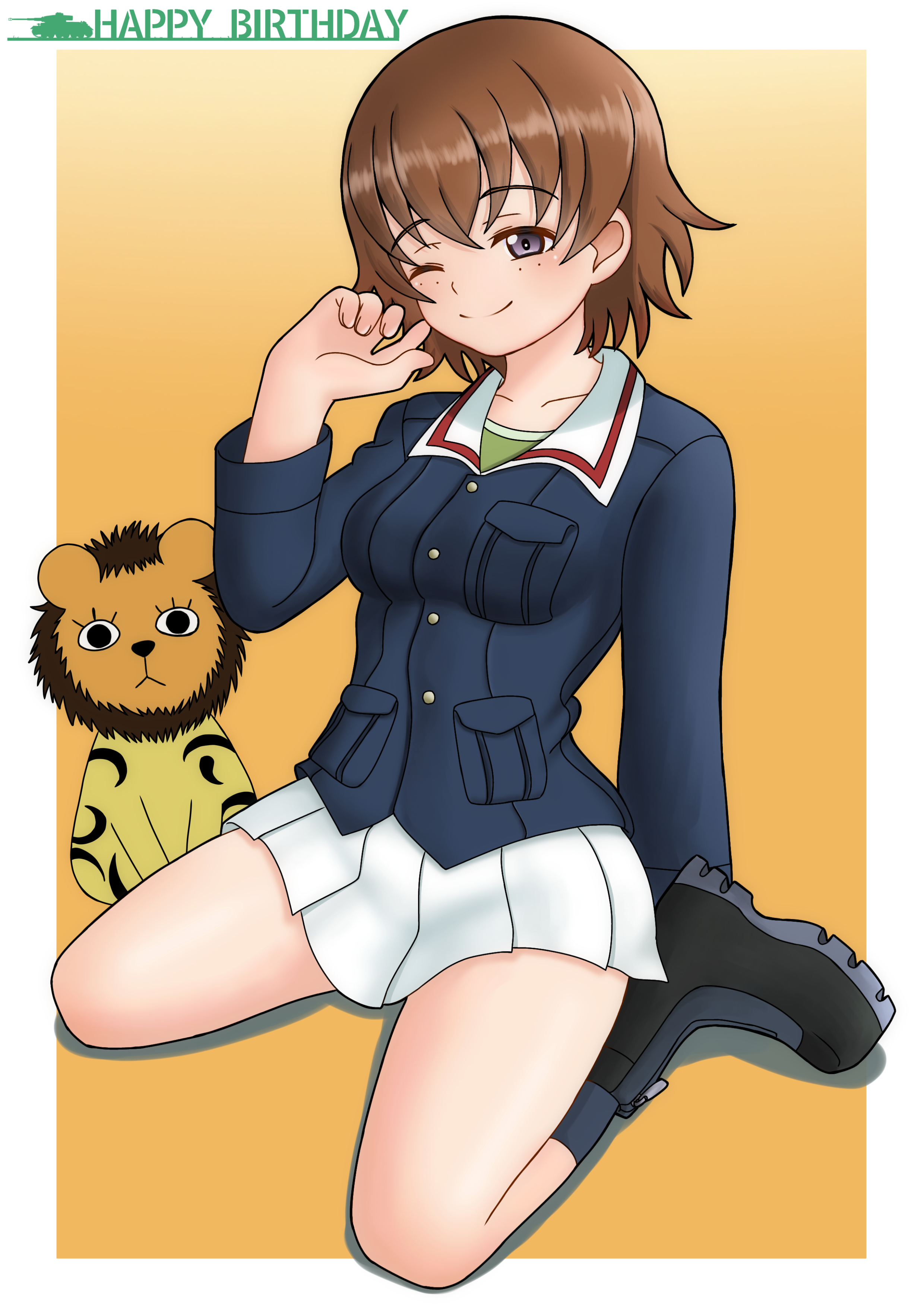 1girl absurdres amanone_yun birthday black_boots black_socks blue_jacket boots brown_eyes brown_hair commentary english_text freckles girls_und_panzer half-closed_eye hand_in_own_hair happy_birthday highres jacket kneehighs leopon_(animal) long_sleeves military_uniform miniskirt one_eye_closed ooarai_military_uniform orange_background pleated_skirt short_hair sitting skirt socks solo stuffed_animal stuffed_toy tsuchiya_(girls_und_panzer) undershirt wariza white_skirt