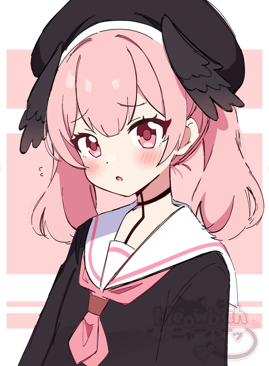 1girl artist_name black_shirt black_wings blue_archive blush feathered_wings flying_sweatdrops halo head_wings highres koharu_(blue_archive) long_sleeves looking_at_viewer low_wings medium_hair meowbah neckerchief non-web_source open_mouth pink_background pink_eyes pink_halo pink_neckerchief sailor_collar shirt simple_background solo sweatdrop swept_bangs two-tone_background upper_body watermark white_background white_sailor_collar winged_hat wings