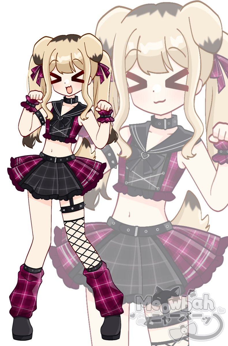 >_< 1girl :3 animal_ears asymmetrical_legwear bare_shoulders black_boots black_collar black_sailor_collar blonde_hair blush boots bracelet character_request collar collarbone crop_top dog_ears fishnet_thighhighs fishnets frills full_body hair_ribbon highres indie_virtual_youtuber jewelry leg_warmers meowbah mismatched_legwear multicolored_hair navel non-web_source open_mouth original paw_pose plaid_clothes pleated_skirt ribbon sailor_collar shirt simple_background single_thighhigh skirt sleeveless smile solo spiked_bracelet spiked_thighlet spikes standing tail thigh_gap thigh_strap thighhighs two-tone_hair white_background zoom_layer