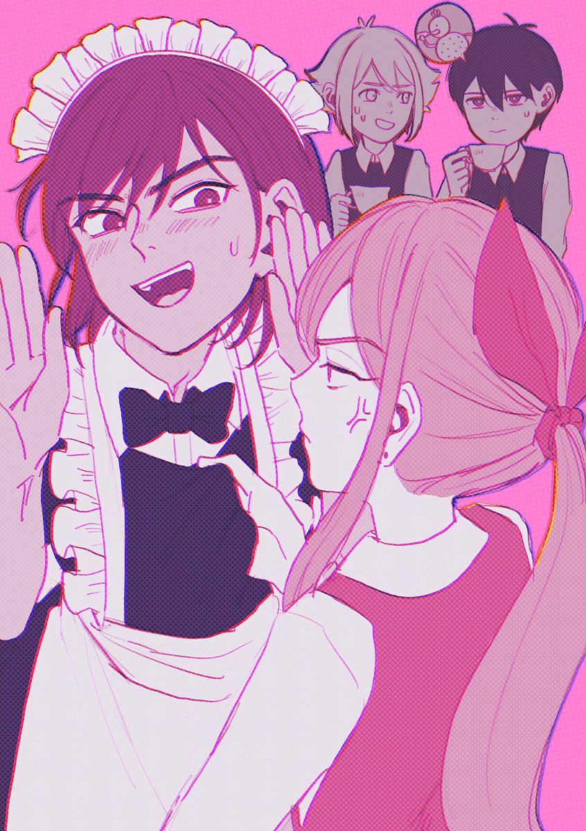 1girl 3boys alternate_costume alternate_hairstyle alternate_sleeve_length antenna_hair aubrey_(faraway)_(omori) aubrey_(omori) basil_(faraway)_(omori) basil_(omori) black_bow black_bowtie black_hair black_sweater_vest blonde_hair blush bow bowtie bright_pupils brown_eyes brown_hair closed_mouth collared_shirt cup ear_piercing enmaided highres holding holding_cup kel_(faraway)_(omori) kel_(omori) long_sleeves looking_at_another maid maid_headdress msdnno_kabe multiple_boys omori open_mouth orange_joe_(omori) piercing pink_background pink_ribbon pink_theme ribbon shirt short_hair short_sleeves simple_background speech_bubble sunny_(omori) sweatdrop sweater_vest teeth upper_teeth_only white_pupils white_shirt