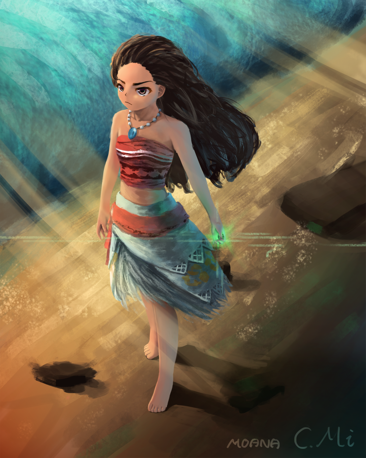 1girl bare_shoulders black_hair brown_eyes brown_hair c.mi curly_hair dark-skinned_female dark_skin flower gem hair_flower hair_ornament highres jewelry long_hair midriff moana_(movie) moana_waialiki necklace solo strapless