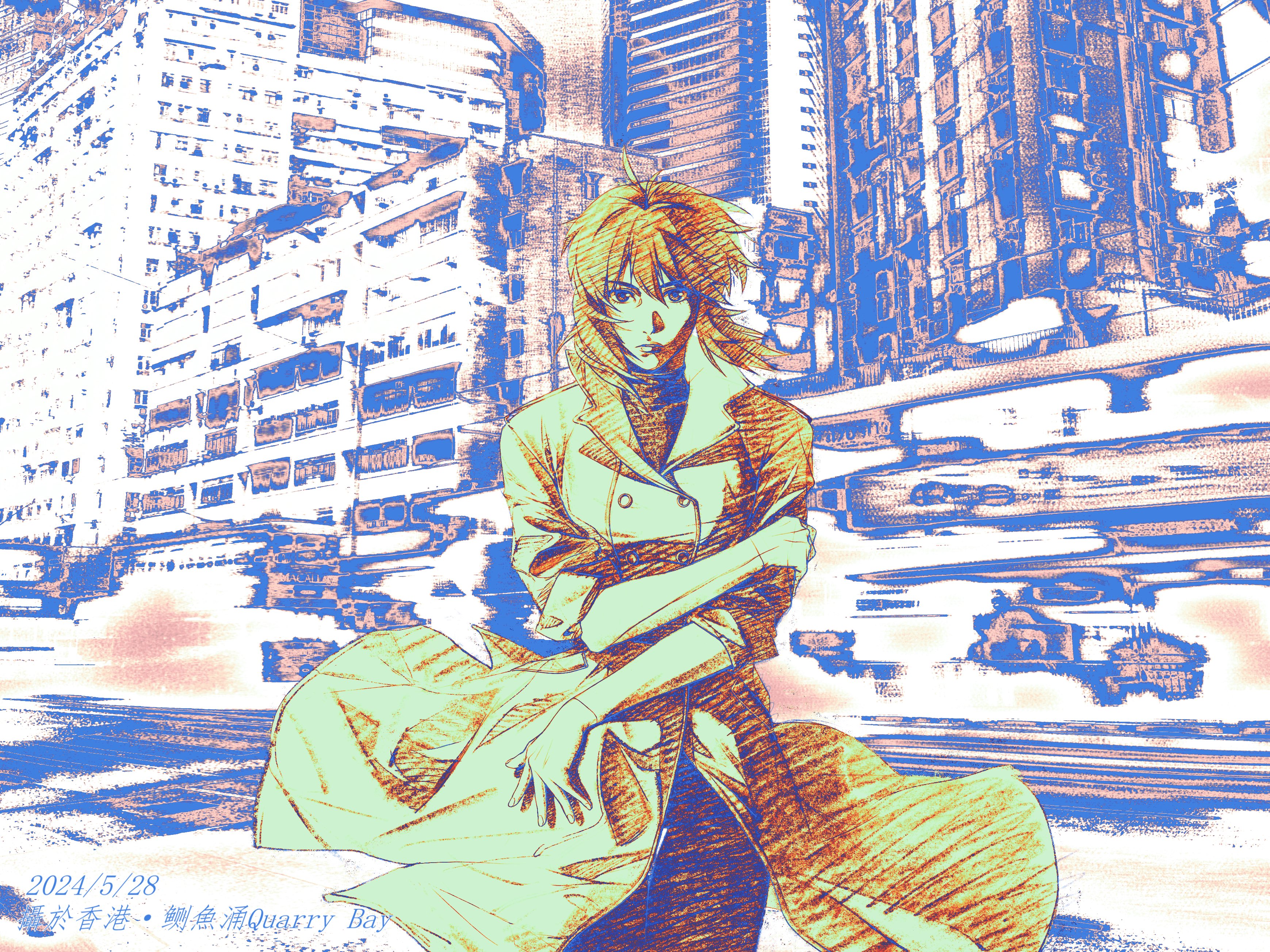 1girl absurdres aizheajsee blurry blurry_background building city coat ghost_in_the_shell highres looking_at_viewer medium_hair road solo straight-on street trench_coat