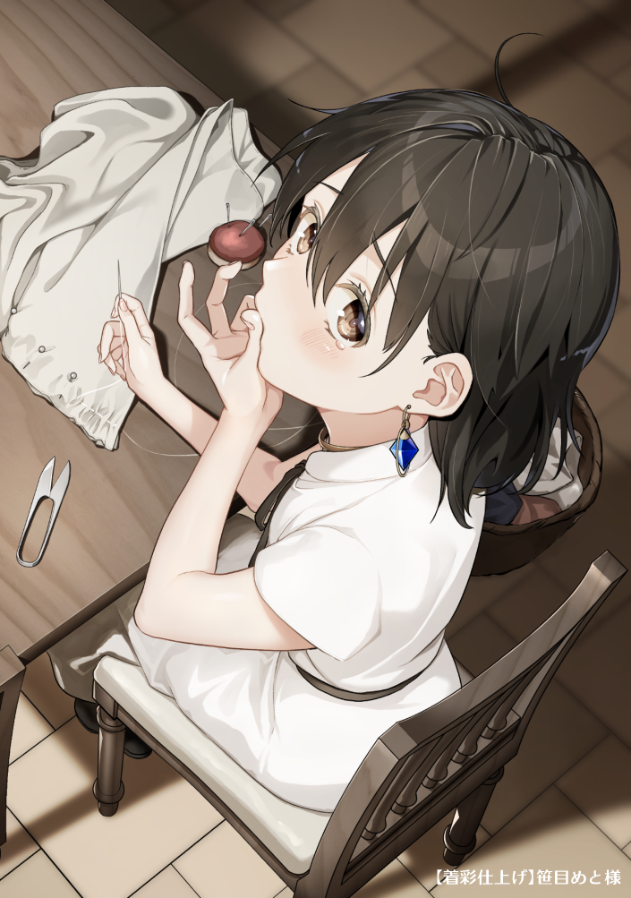 1girl basket blue_gem brown_eyes brown_hair brown_ribbon brown_shoes chair collar dress earrings finger_sucking fingernails from_above gem holding_sewing_needle ikuwataru_nagomi indoors jewelry looking_at_viewer metal_collar needle original pincushion ribbon scissors sewing_needle shoes sitting solo string table tearing_up tile_floor tiles translation_request unworn_clothes white_dress