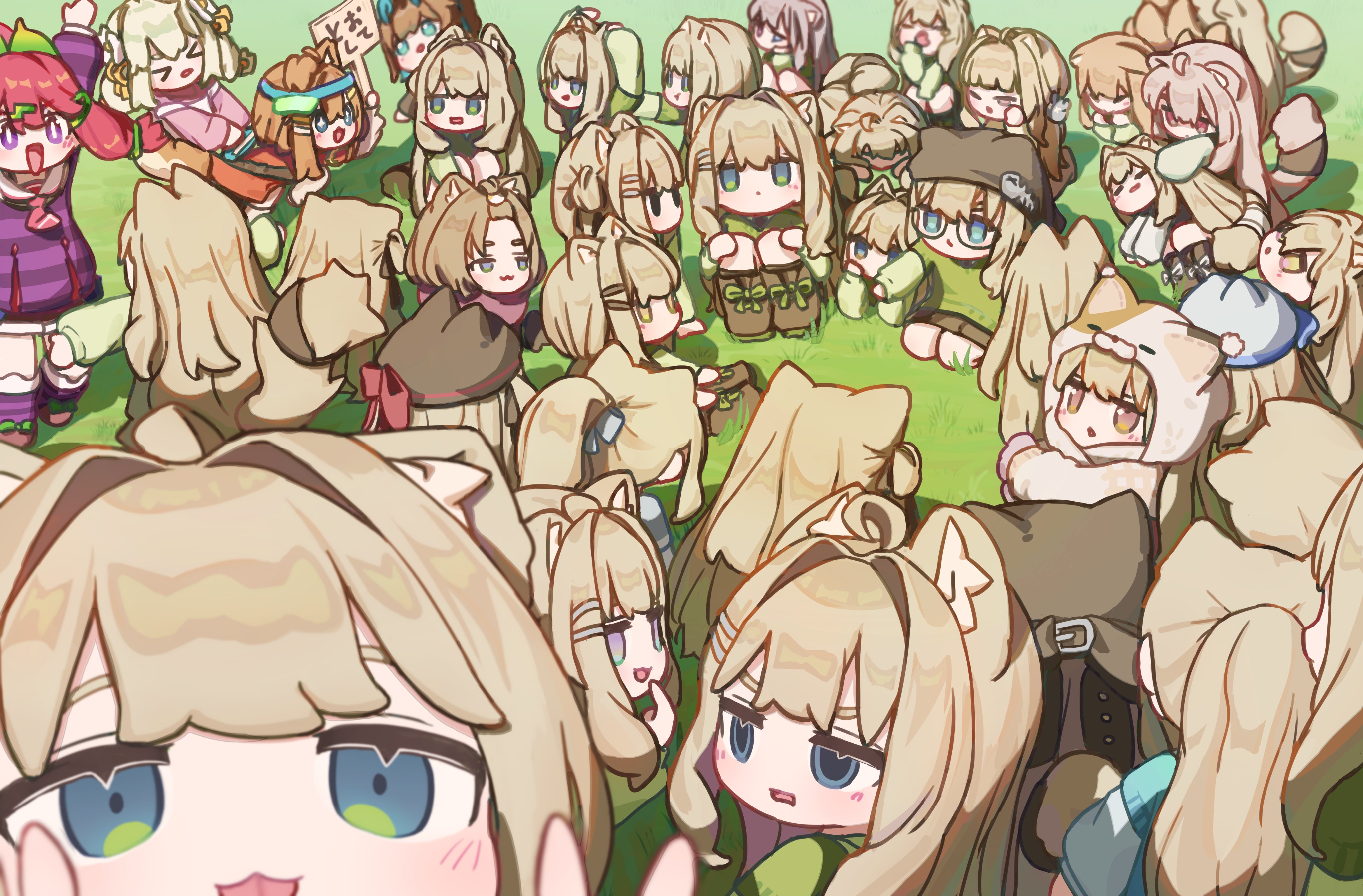 >_< 6+girls :3 absurdres ahoge all_fours animal_ears animal_hat arms_up bangs_pinned_back blonde_hair blue_eyes boots bow brown_eyes cat_hat character_request clone double_v glasses grass grey_hair hair_intakes hair_ornament hairclip hat highres holding holding_sign isanai_nuku_(vrchat) jitome kipfel_(vrchat) long_hair mamehinata minahoshi_(vrchat) multiple_girls neko_kakera no_nose outdoors peeking_out purple_eyes red_hair sign sitting tail too_many v vrchat
