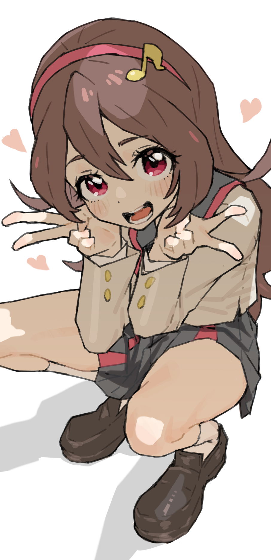 1girl ankle_socks blush brown_hair fortissimo grey_skirt hair_ornament hanamichi_middle_school_uniform heart highres kimi_to_idol_precure looking_at_viewer mo_(boo1719501boo) musical_note musical_note_hair_ornament pink_eyes precure sakura_uta_(precure) school_uniform shirt skirt socks solo spread_legs tiara v white_background white_shirt