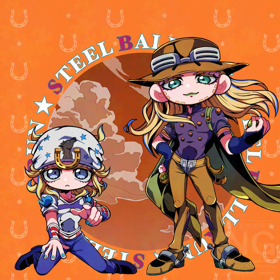 2boys ball beanie beard belt belt_buckle blonde_hair blue_bridal_gauntlets blue_eyes blue_lips blue_nails blue_pants bridal_gauntlets brown_belt brown_hat brown_pants buckle cape chaps chibi closed_mouth commentary_request cowboy_hat facial_hair goggles goggles_on_headwear green_cape green_eyes green_lips grey_hat grey_hoodie grey_sleeves gyro_zeppeli hand_on_own_hip hat heart_ornament high_collar holding holding_ball holster hood hoodie horseshoe horseshoe_hat_ornament horseshoe_ornament johnny_joestar jojo_no_kimyou_na_bouken kneeling long_hair looking_at_viewer male_focus medium_hair multicolored_wristband multiple_boys orange_sleeves pants pointing pointing_at_viewer purple_shirt purple_sleeves red_sleeves shirt short_sleeves spurs standing star_(symbol) star_print steel_ball_(jojo) steel_ball_run two-tone_sleeves yoyo00_suke