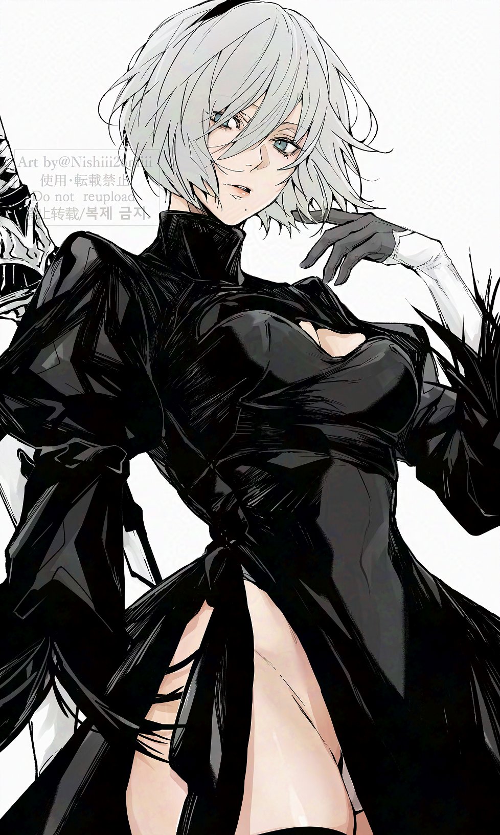 1girl 2b_(nier:automata) android breasts commentary gloves hairband highres looking_at_viewer mole nier:automata nier_(series) nishiii26miii simple_background small_breasts solo sword thigh_peek thighs weapon white_background white_hair