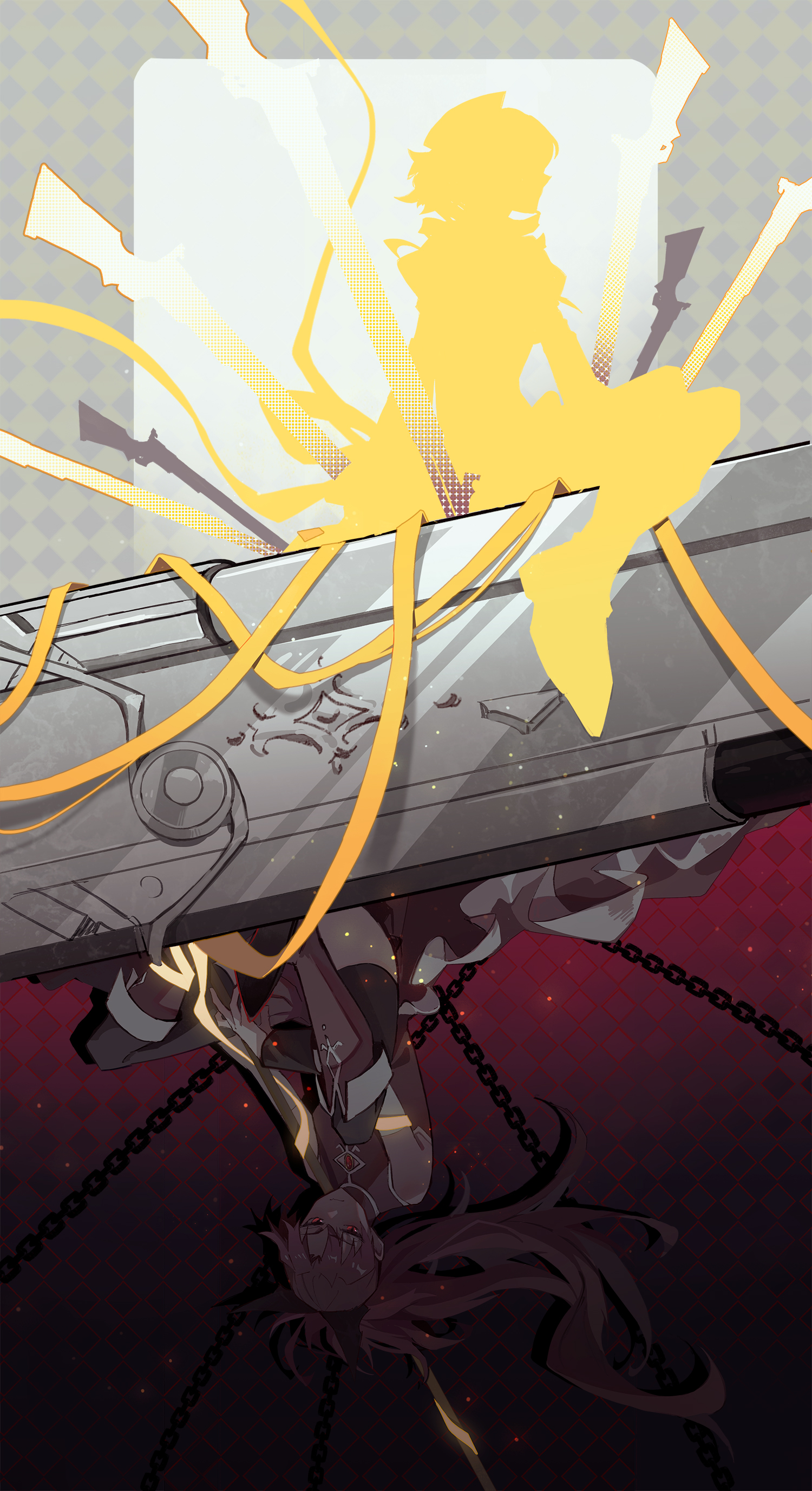 2girls abstract_background absurdres black_gloves black_ribbon boots breasts brown_skirt chain closed_mouth commentary corset detached_sleeves drill_hair elbow_gloves fingerless_gloves full_body fur_trim gem gloves gun hair_ornament hair_ribbon halftone hat high_collar highres knee_boots large_breasts long_hair looking_to_the_side magical_girl magical_musket_(madoka_magica) mahou_shoujo_madoka_magica mahou_shoujo_madoka_magica_(anime) medium_hair multiple_girls neck_ribbon parted_bangs ponytail puffy_short_sleeves puffy_sleeves red_boots red_eyes red_gem red_hair ribbon sakura_kyoko sakura_kyoko_(magical_girl) shirt short_sleeves silhouette sitting skirt sleeveless swept_bangs thighhighs tomoe_mami tomoe_mami_(magical_girl) twin_drills upside-down weapon white_gloves white_ribbon winehusk wrist_cuffs yellow_boots yellow_eyes yellow_gem yellow_ribbon