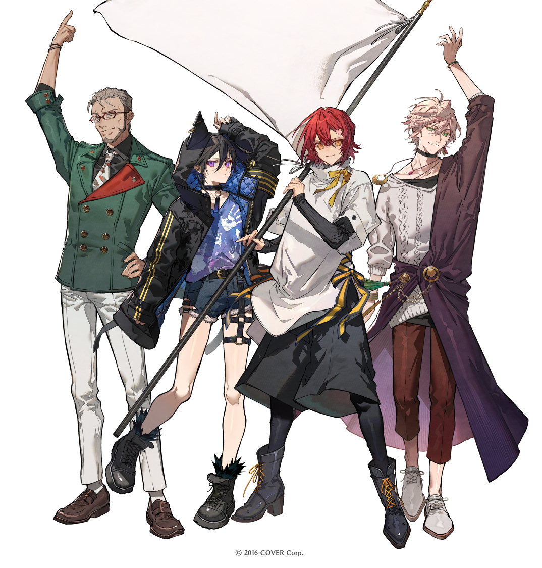 4boys animal_hood arm_up arurandeisu arurandeisu_(old_design) black_hair cat_hood collar commentary_request denim denim_shorts flag full_body green_eyes grey_hair hair_between_eyes hair_ornament hairclip hanasaki_miyabi hanasaki_miyabi_(1st_costume) holding holding_flag holostars hood jacket kanade_izuru kanade_izuru_(1st_costume) looking_at_viewer male_focus multicolored_hair multiple_boys nozaki_tsubata official_art padded_jacket pants pink_hair purple_eyes red_hair rikka_(holostars) shirt short_hair shorts smile standing streaked_hair virtual_youtuber white_background