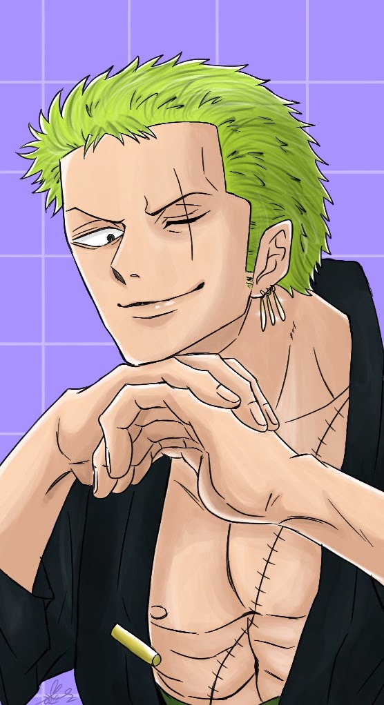 1boy commentary_request earrings green_hair japanese_clothes jewelry kimono lezor male_focus one_piece purple_background roronoa_zoro short_hair sideburns signature smile solo stitched_torso stitches upper_body