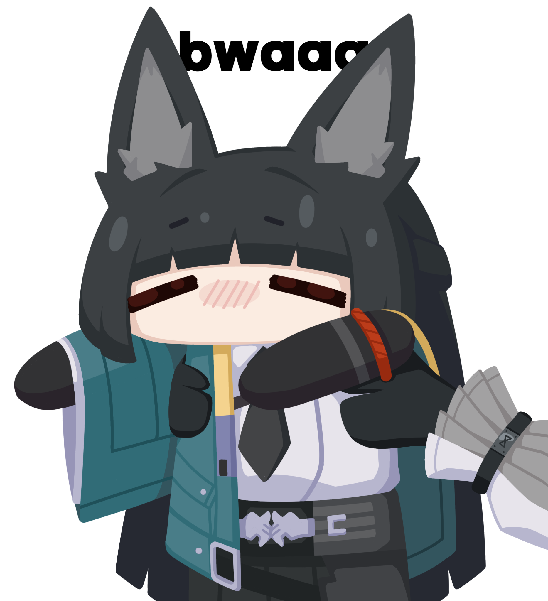 2girls =_= animal_ears armpit_carry black_hair black_necktie black_skirt blush closed_eyes commentary english_text fox_ears fox_girl green_jacket gribberoni highres hoshimi_miyabi jacket long_hair multiple_girls necktie open_clothes open_jacket shirt simple_background skirt tsukishiro_yanagi white_background white_shirt zenless_zone_zero