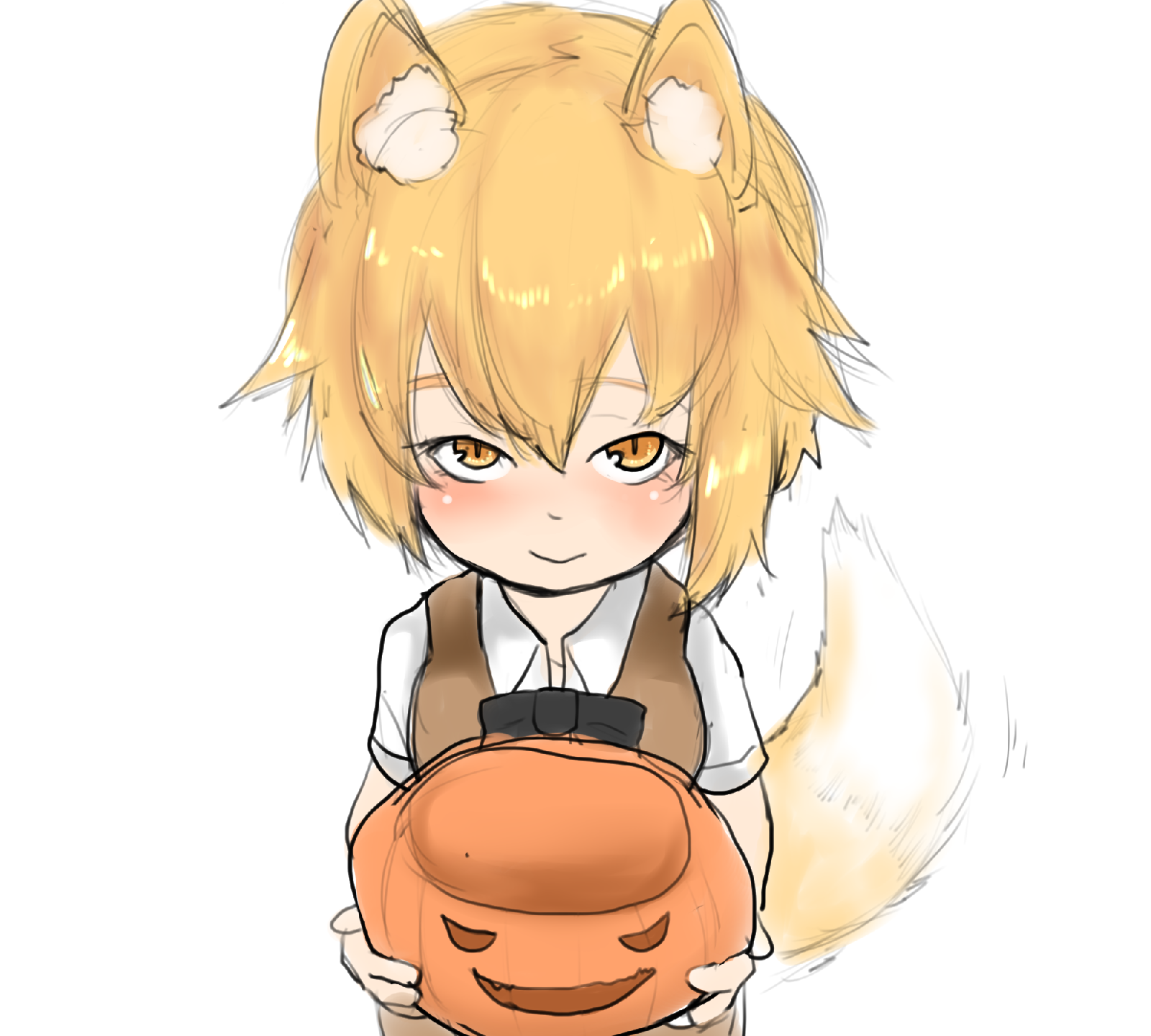 1girl animal_ear_fluff animal_ears black_bow black_bowtie blonde_hair blush bow bowtie brown_vest closed_mouth collared_shirt commentary_request cookie_(touhou) fox_ears fox_girl fox_tail halloween_bucket highres looking_at_viewer miramikaru_riran shirt short_hair short_sleeves simple_background smile solo tail unimamo upper_body vest white_background white_shirt yellow_eyes