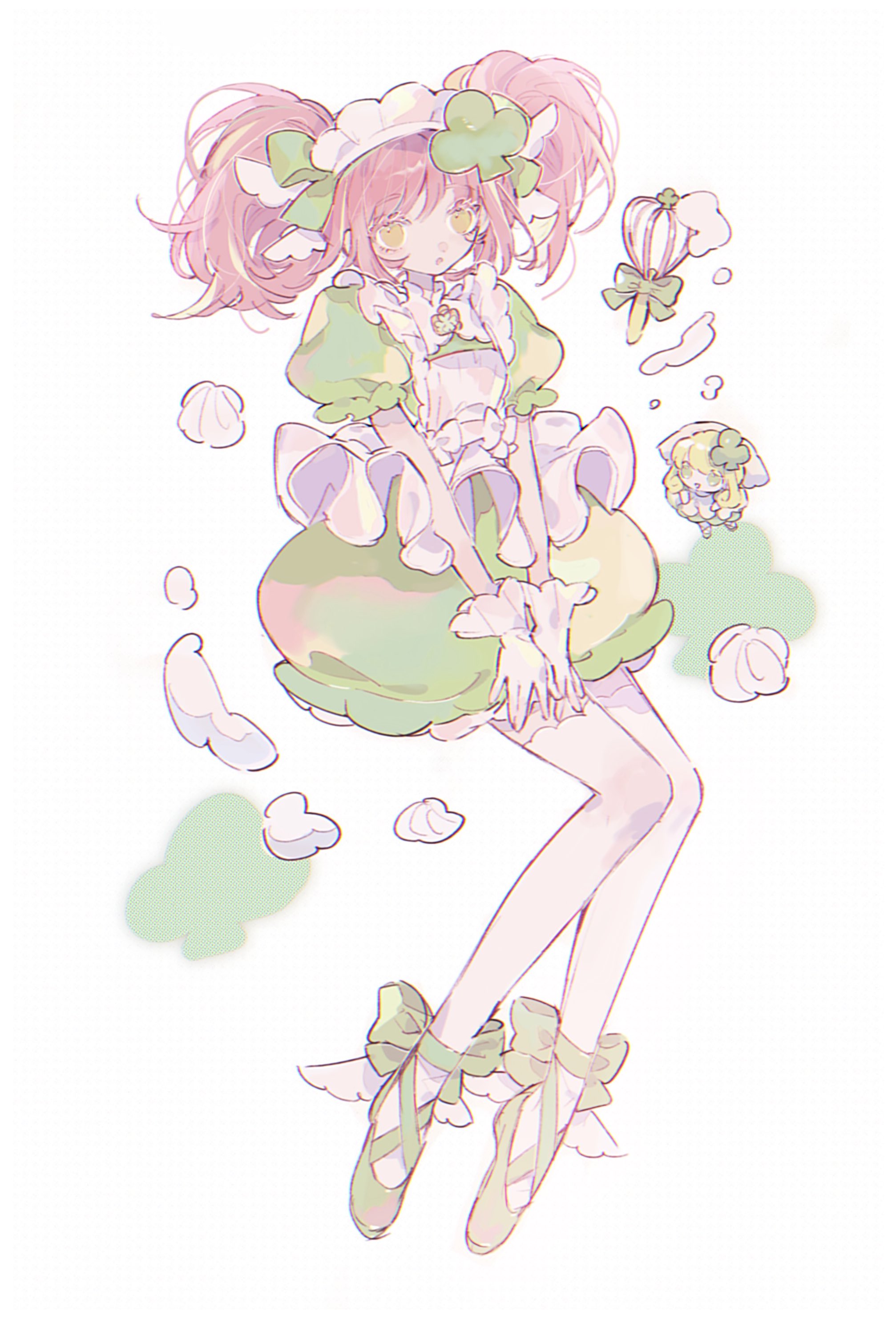 2girls absurdres apron blonde_hair commentary dress gloves green_dress green_shoes highres hinamori_amu looking_at_viewer magical_girl maid_headdress multiple_girls pink_hair puffy_short_sleeves puffy_sleeves ronoh_(jill) shoes short_sleeves shugo_chara! simple_background suu_(shugo_chara!) untranslatable_commentary twintails whipped_cream whisk white_apron white_background white_gloves yellow_eyes
