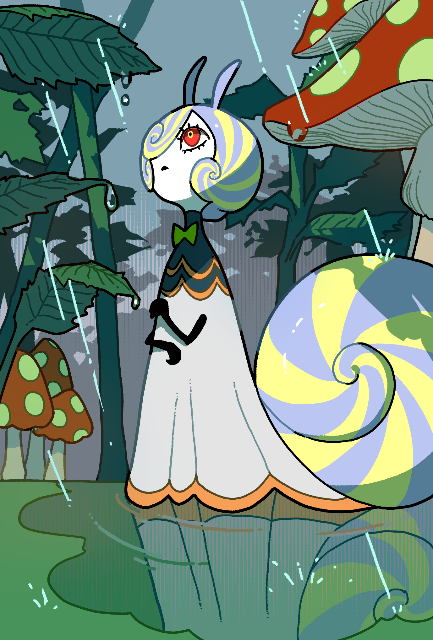 1girl antennae blonde_hair blue_hair hair_over_one_eye highres mini_person minigirl momomo_906 multicolored_hair mushroom original outdoors overcast puddle rain red_eyes shell sky snail_girl solo streaked_hair