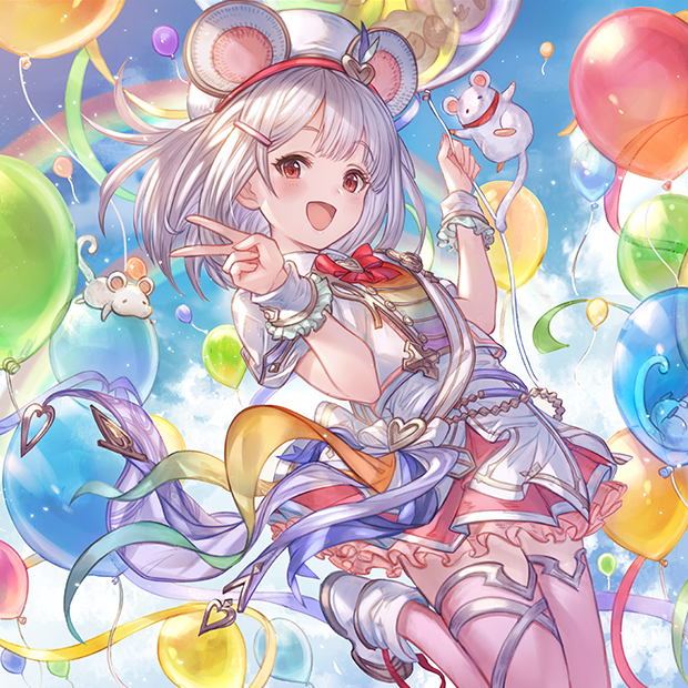 animal_ears balloon blush frilled_skirt frills granblue_fantasy hat hime_cut mouse_(animal) official_art open_mouth pink_thighhighs red_eyes shoes short_hair skirt smile thighhighs v vikala_(granblue_fantasy) vikala_(parade_master) white_hair