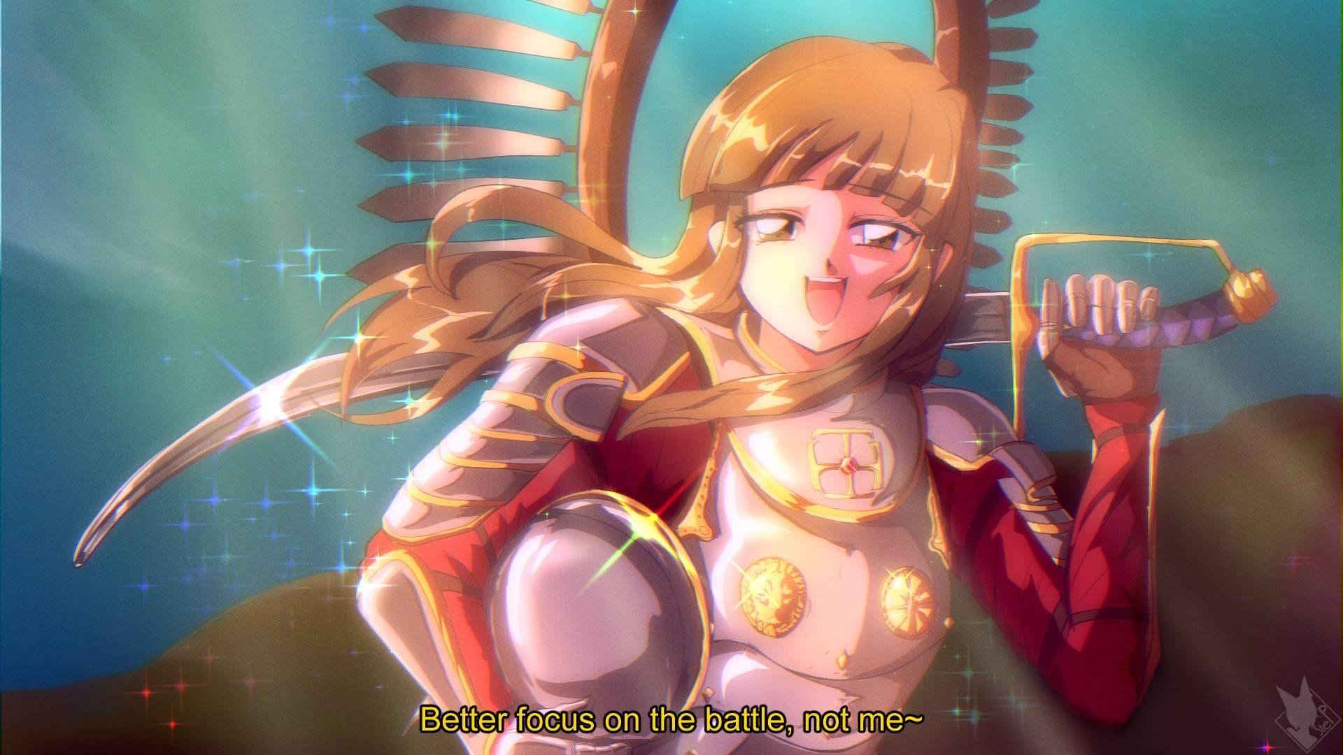 1girl armor breastplate brown_hair commission cuirass english_text feathers gauntlets highres holding holding_sword holding_weapon hussar long_hair looking_at_viewer military military_uniform open_mouth original pauldrons saber_(weapon) shoulder_armor solo step_arts subtitled sword tongue vambraces weapon winged_hussar