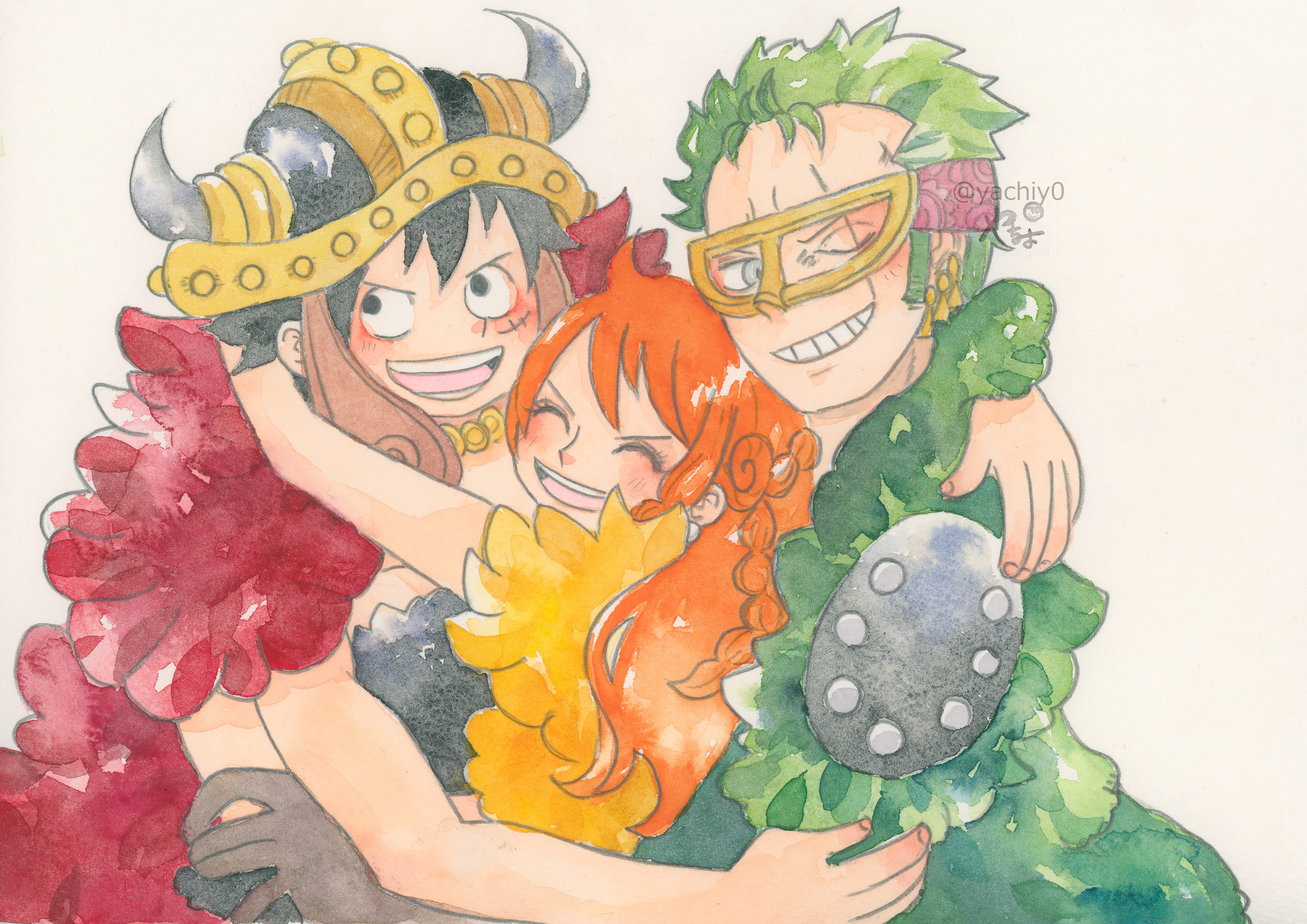 1girl 2boys absurdres arm_around_shoulder arms_around_neck black_hair blush brown_gloves cape capelet closed_eyes commentary_request earrings eye_mask facial_scar fake_horns fur-trimmed_cape fur_trim gloves gold_earrings green_cape green_hair grey_background grin helmet highres horned_helmet horns hug jewelry long_hair looking_at_viewer mask monkey_d._luffy multiple_boys nami_(one_piece) nami_(one_piece)_(elbaf) necklace official_alternate_costume one_eye_closed one_piece open_mouth orange_hair red_cape roronoa_zoro scar scar_across_eye scar_on_cheek scar_on_face short_hair shoulder_pads smile straw_hat_pirates traditional_media twitter_username upper_body wavy_hair yachiy0 yellow_capelet