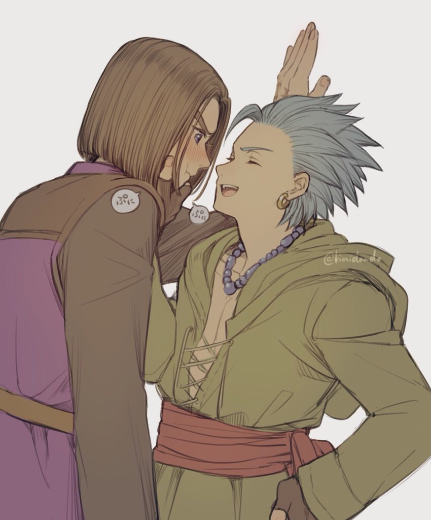 2boys bead_necklace beads black_sleeves blue_eyes blue_hair blush brown_gloves brown_hair camus_(dq11) closed_eyes collarbone commentary_request couple cross-laced_clothes dragon_quest dragon_quest_xi earrings fingerless_gloves gloves gold_earrings grabbing_another's_chin green_tunic hand_on_another's_chin hand_on_own_hip hand_on_wall hero_(dq11) hoop_earrings jewelry kimidori_(kimidoriri) male_focus medium_hair multiple_boys necklace open_mouth parted_hair profile purple_tunic red_sash sash short_hair single_bang speech_bubble spiked_hair tunic twitter_username upper_body white_background yaoi