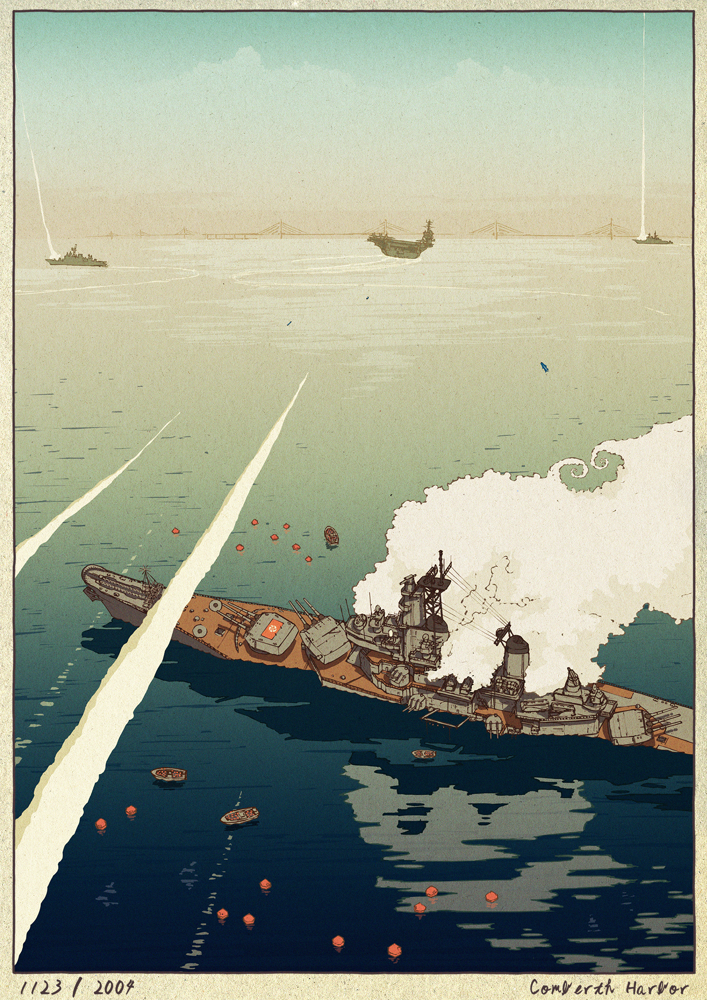 ace_combat ace_combat_04 battleship boat border commentary_request day english_text fine_art_parody highres horizon lifeboat military military_vehicle nihonga no_humans ocean outdoors parody ship sinking ukiyo-e warship water watercraft yuukou