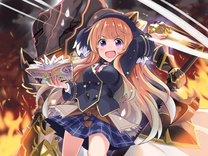 2girls armor black_armor blue_jacket blue_skirt book breasts buttons commentary_request cowboy_shot double-breasted fiery_background fire freshman_lou full_armor gradient_hair grey_hair holding holding_book holding_sword holding_weapon ito_ryo jacket jun_(princess_connect!) large_breasts long_hair looking_at_viewer miniskirt multicolored_hair multiple_girls orange_hair plaid_clothes plaid_skirt pleated_skirt princess_connect! skirt standing sweat sword very_long_hair weapon