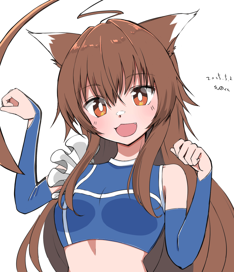 1girl :3 ahoge animal_ears blue_shirt bridal_gauntlets brown_eyes cheerleader fox_ears hokkaido_nippon-ham_fighters huge_ahoge kantai_collection kuma_(cheerleader)_(kancolle) kuma_(kancolle) nippon_professional_baseball one-hour_drawing_challenge paw_pose shirt sleeveless sleeveless_shirt smile solo upper_body wada-kun
