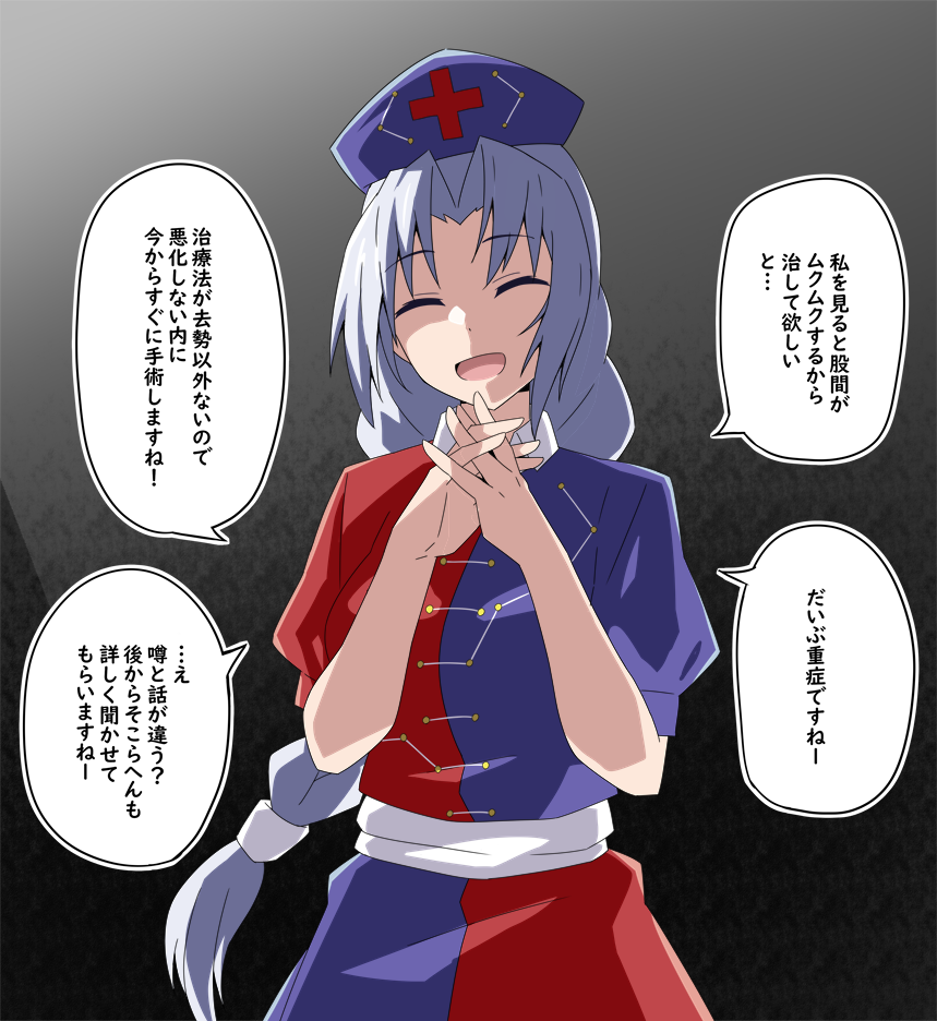 1girl braid breasts closed_eyes commentary_request constellation_print cross digging_your_own_grave dress facing_viewer false_smile grey_hair hat interlocked_fingers long_hair multicolored_dress nurse_cap open_mouth own_hands_together purple_dress purple_hat red_cross red_dress single_braid smile solo speech_bubble touhou to~fuya translation_request very_long_hair yagokoro_eirin