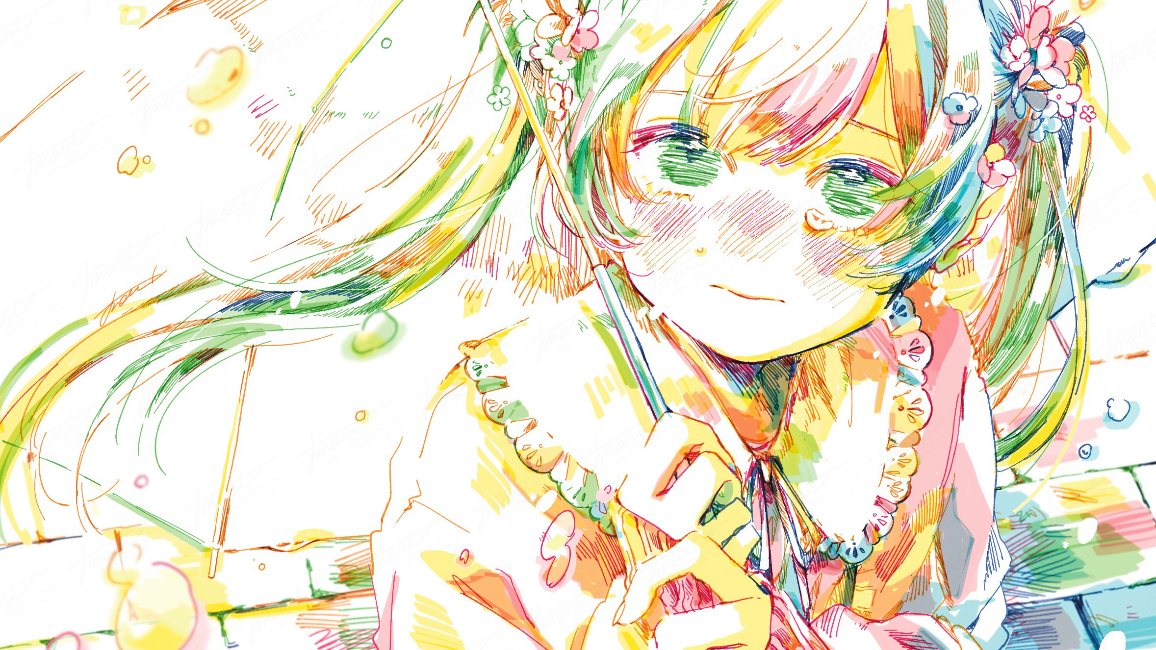 1girl blush brick_road closed_mouth flower hair_flower hair_ornament hatching_(texture) hatsune_miku highres holding holding_umbrella long_hair looking_at_viewer melt_(vocaloid) outdoors signature solo tears twintails umbrella upper_body vocaloid watanabe_tomari