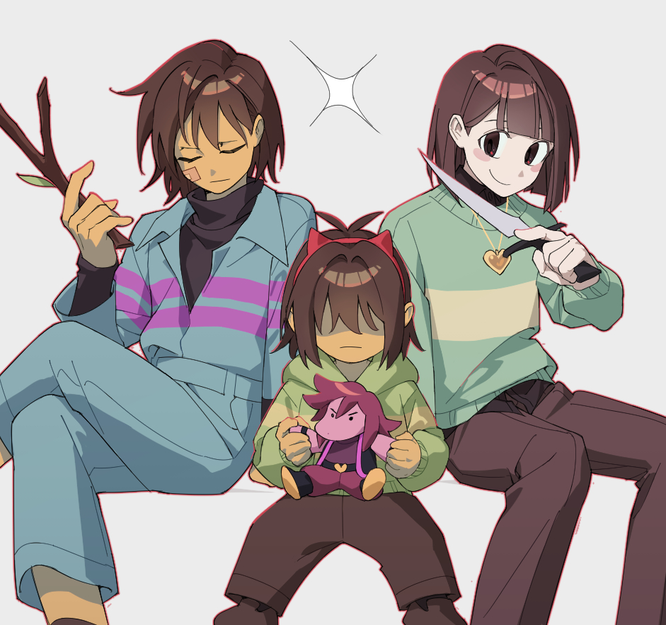 3others androgynous bandaid bandaid_on_cheek bandaid_on_face blue_pants blue_shirt blunt_bangs brown_hair brown_pants chara_(undertale) character_doll closed_eyes covered_eyes crossed_legs dagger deltarune doll facing_viewer fake_horns frisk_(undertale) green_sweater hairband heart_pendant holding holding_dagger holding_doll holding_knife holding_stick holding_weapon horn_hairband horns in-franchise_crossover knife kris_(deltarune) looking_at_viewer multiple_others other_focus pants red_hairband sanbel780308 shirt short_hair simple_background sitting smile stick susie_(dark_world)_(deltarune) susie_(deltarune) sweater undertale utdr_(toby_fox) weapon white_background
