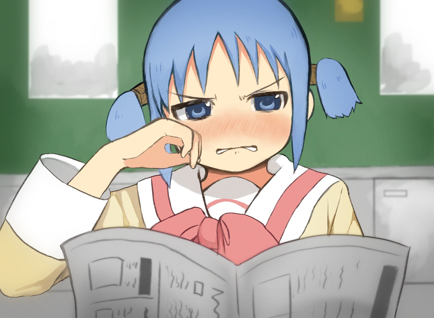 1girl averting_eyes blue_eyes blue_hair blush bow bowtie classroom clenched_teeth commentary_request cube_hair_ornament furrowed_brow grimace hair_ornament half-closed_eyes hand_on_own_cheek hand_on_own_face indoors locker naganohara_mio naganoharamiomio newspaper nichijou red_bow red_bowtie sailor_collar school_uniform short_hair short_twintails solo teeth tokisadame_school_uniform twintails v-shaped_eyebrows white_sailor_collar