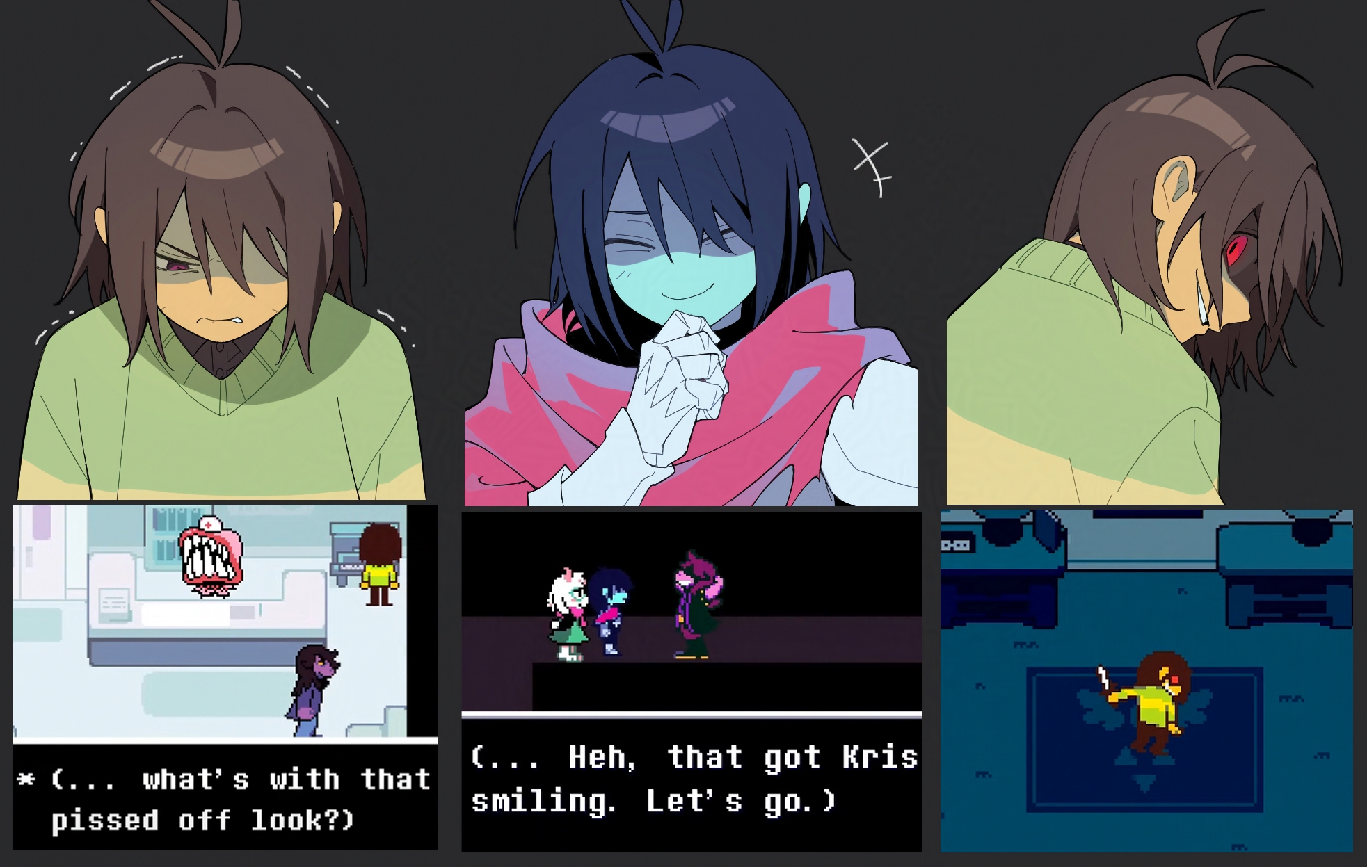 1other androgynous antenna_hair black_background blue_hair blue_skin brown_hair closed_eyes colored_skin deltarune frown green_sweater highres kris_(dark_world)_(deltarune) kris_(deltarune) multiple_expressions multiple_views red_eyes reference_inset sanbel780308 screenshot_inset short_hair susie_(dark_world)_(deltarune) susie_(deltarune) sweater trembling upper_body utdr_(toby_fox)