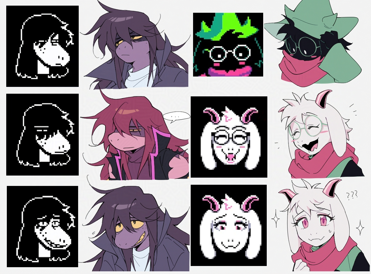 ... 1boy 1girl ^_^ animal_ears closed_eyes colored_skin deltarune fangs furry furry_female furry_male glasses goat_boy goat_ears goat_horns green-framed_eyewear green_hat hat horns long_hair looking_at_viewer multiple_expressions multiple_views open_mouth pink_eyes pink_hair pink_scarf pink_skin portrait purple_hair ralsei ralsei_(hat) reference_inset round_eyewear sanbel780308 scarf screenshot_inset simple_background smile sparkle spoken_ellipsis susie_(dark_world)_(deltarune) susie_(deltarune) utdr_(toby_fox) white_background