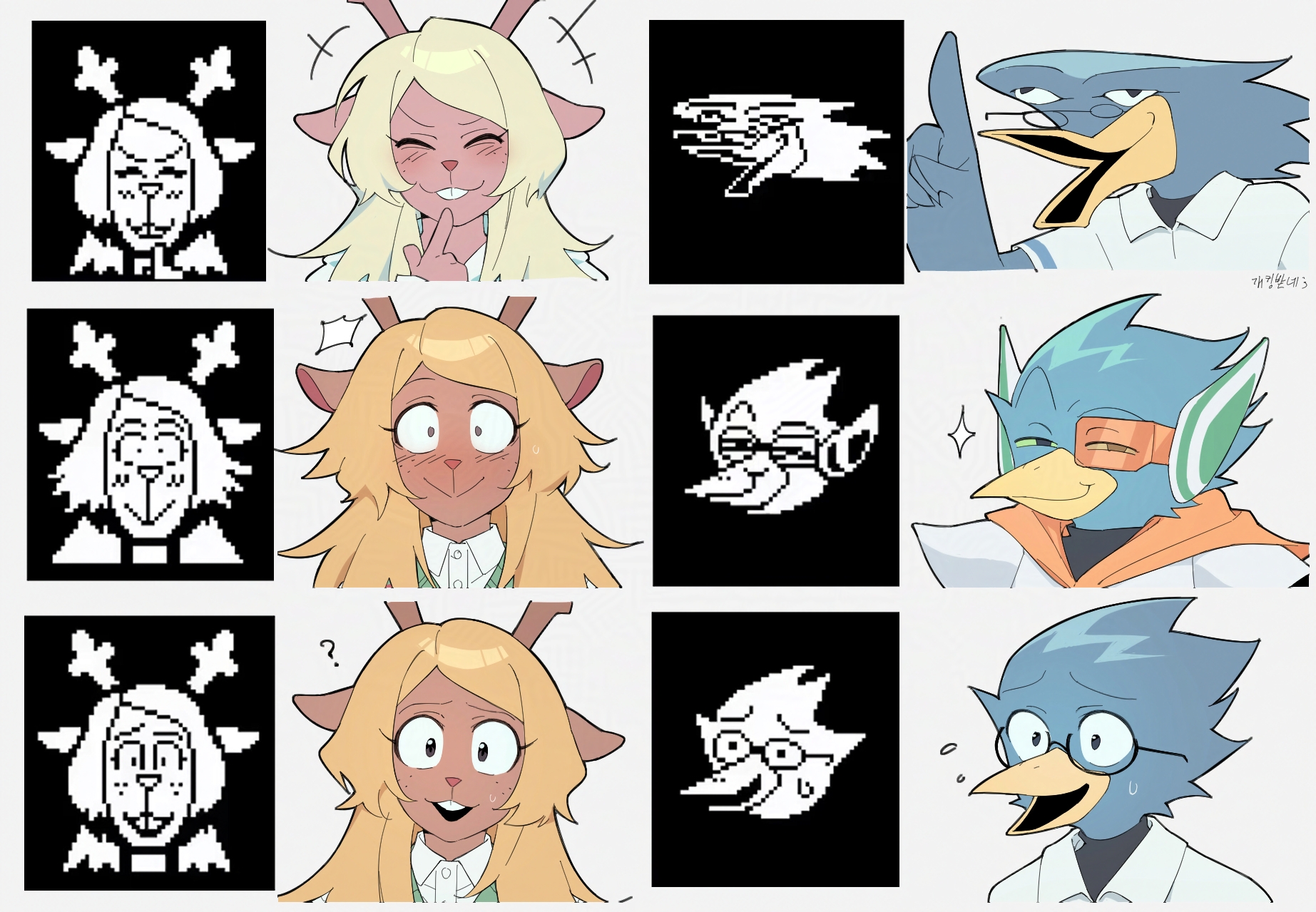 +++ 1boy 1girl ? animal_ears beak berdly_(dark_world)_(deltarune) berdly_(deltarune) bird_boy black-framed_eyewear blonde_hair buck_teeth closed_eyes deer_ears deer_girl deltarune furry furry_female furry_male glasses highres index_finger_raised long_hair looking_at_viewer multiple_expressions multiple_views noelle_holiday noelle_holiday_(dark_world) open_mouth portrait raised_eyebrow reference_inset round_eyewear sanbel780308 screenshot_inset simple_background teeth utdr_(toby_fox) white_background