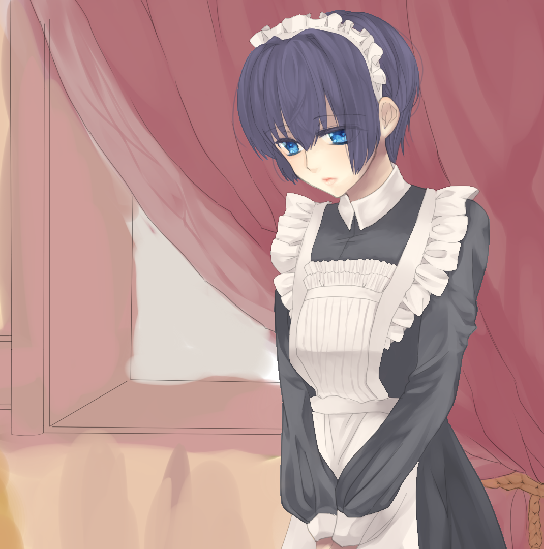 1boy alternate_costume apron axis_powers_hetalia black_dress black_hair blue_eyes closed_mouth commentary_request crossdressing crossdressing_(mtf) curtains draw2_(milkcrown) dress enmaided expressionless frilled_apron frills japan_(hetalia) looking_down maid maid_headdress male_focus male_maid short_hair solo upper_body white_apron