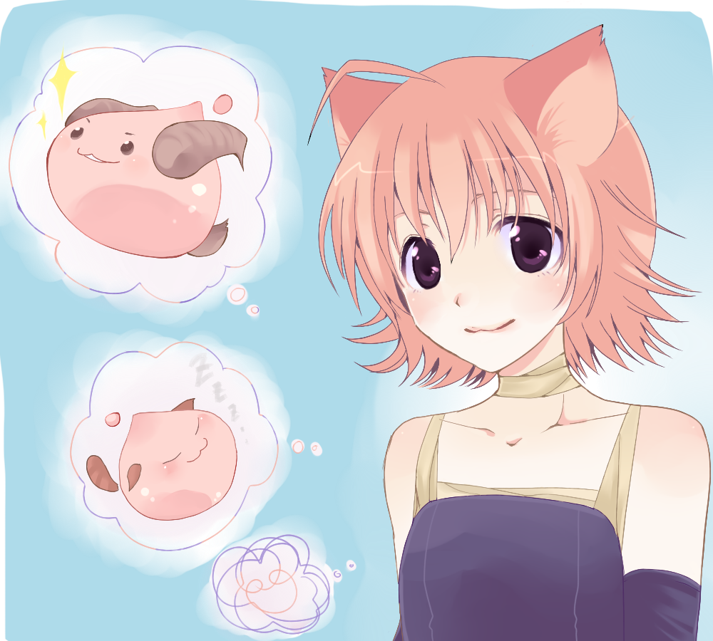 1boy :3 animal_ears assassin_(ragnarok_online) bandages blue_background blush cat_boy cat_ears closed_mouth crossdressing crossdressing_(mtf) draw2_(milkcrown) looking_at_viewer male_focus misty_(ragnarok_online) pink_hair poring purple_eyes purple_shirt ragnarok_online shirt short_hair slime_(creature) smile solo strapless strapless_shirt trap upper_body