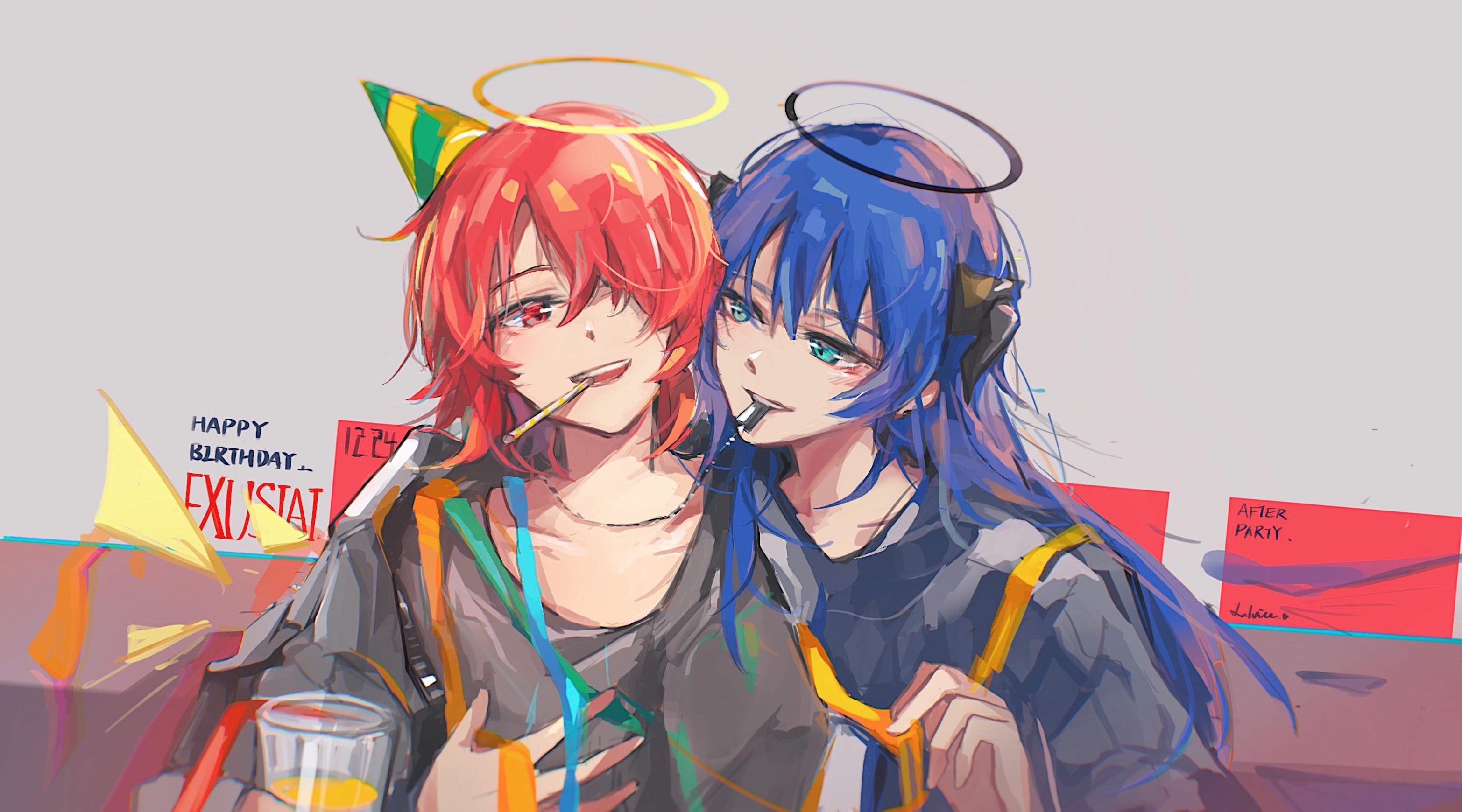 2girls aqua_eyes arknights black_halo black_horns black_shirt blue_hair blue_ribbon character_name chinese_commentary collarbone commentary_request exusiai_(arknights) green_ribbon grey_background hair_between_eyes hair_over_one_eye halo happy_birthday hat heads_together highres horns lalvice long_hair looking_at_another mostima_(arknights) mouth_hold multiple_girls one_eye_covered open_mouth party_hat red_eyes red_hair ribbon shirt short_hair smile t-shirt traditional_halo upper_body yellow_halo yellow_ribbon yuri