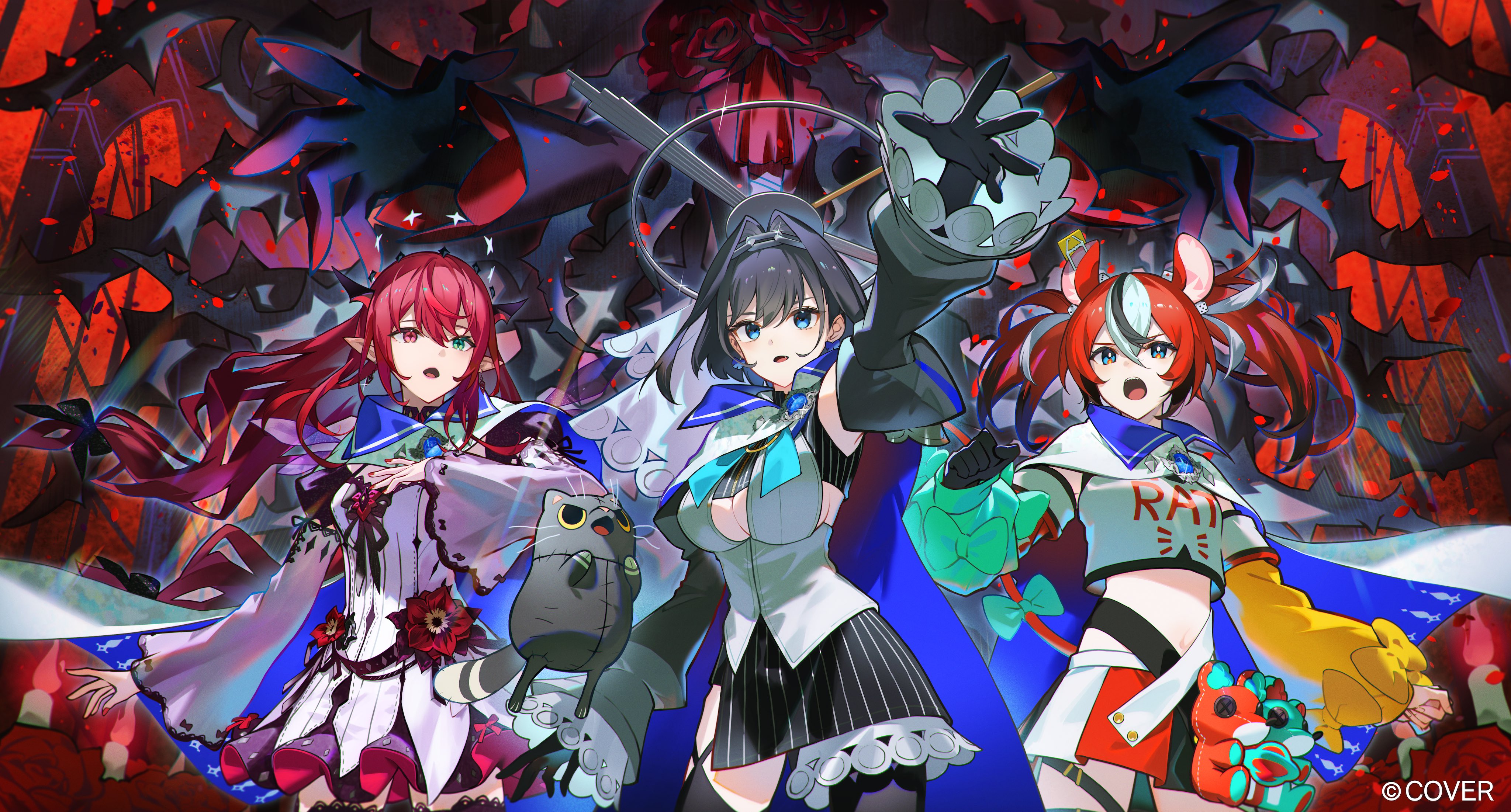 3girls absurdres animal_ears asymmetrical_sleeves bilingual_commentary black_gloves black_hair black_skirt black_thighhighs blue_bow blue_bowtie blue_eyes blue_hair bow bowtie breasts chain chain_headband clothes_writing colored_tips commentary copyright_notice cropped_shirt crystal_wings detached_sleeves detached_wings double-parted_bangs double_halo dress earrings english_commentary enigmatic_recollection fanged_bangs frilled_skirt frilled_sleeves frills gloves green_sleeves hair_between_eyes hair_intakes hakos_baelz hakos_baelz_(1st_costume) half-skirt halo headband highres hololive hololive_english horns irys_(hololive) irys_(irys_2.0)_(hololive) jewelry juliet_sleeves large_breasts long_hair long_sleeves low-tied_long_hair mechanical_halo mini_wings miniskirt mismatched_sleeves mixed-language_commentary mouse_ears mouse_girl multicolored_hair multicolored_skirt multiple_girls navel official_art open_mouth ouro_kronii ouro_kronii_(1st_costume) outstretched_arm pink_eyes pinstripe_pattern pinstripe_skirt pleated_skirt pointy_ears puffy_sleeves purple_hair red_hair shirt short_dress short_hair single_glove skirt star_halo streaked_hair teru2307 thigh_strap thighhighs twintails veil very_long_hair vest virtual_youtuber white_dress white_hair white_shirt white_sleeves white_veil white_vest wide_sleeves wings yellow_sleeves