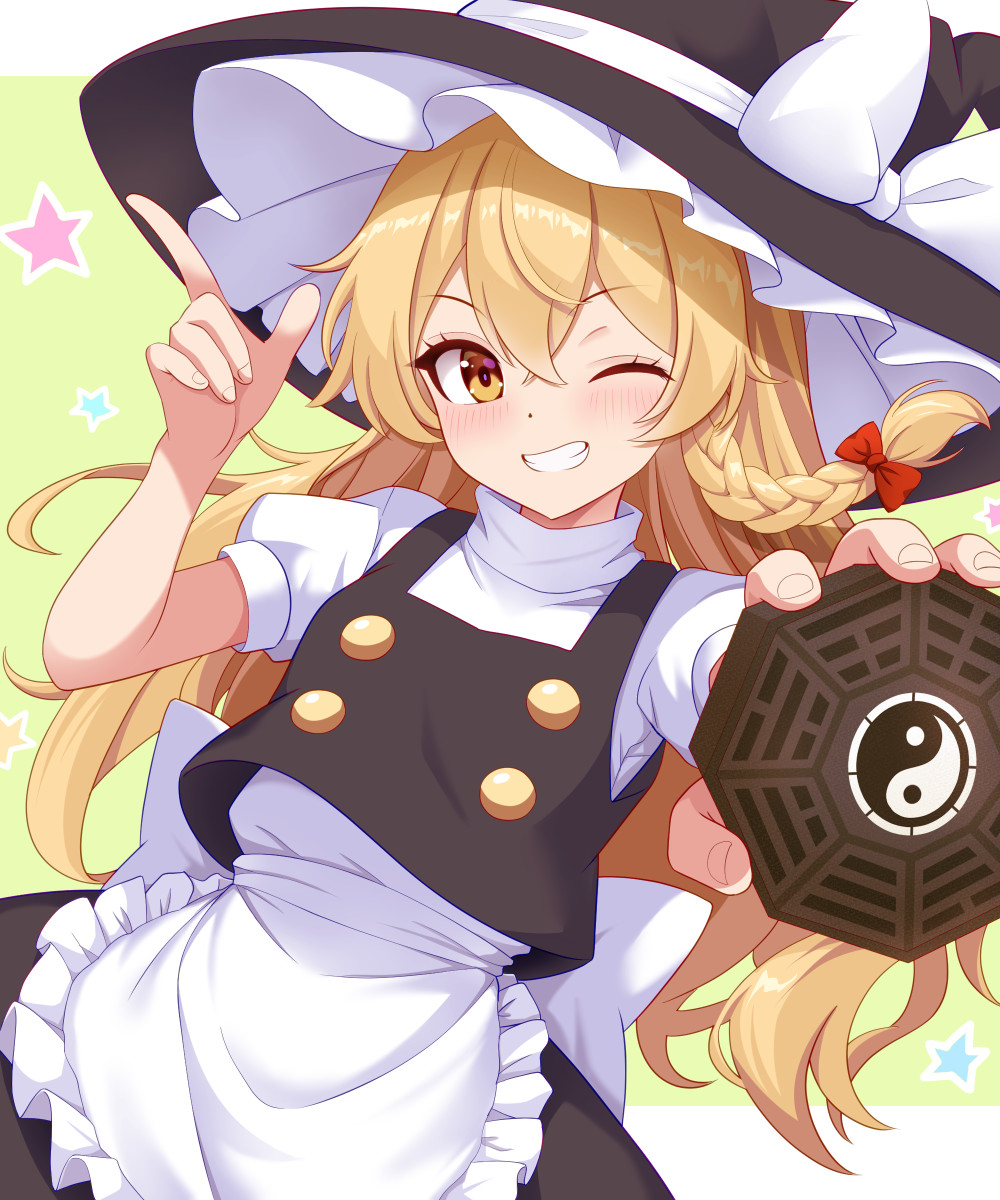 1girl apron black_hat black_skirt black_vest blonde_hair bow braid commentary_request cowboy_shot grin hair_between_eyes hair_bow hat hat_bow highres holding kirisame_marisa kisaragi_koushi long_hair looking_at_viewer mini-hakkero one_eye_closed puffy_short_sleeves puffy_sleeves red_bow shirt short_sleeves side_braid single_braid skirt smile solo star_(symbol) touhou trigram very_long_hair vest waist_apron white_apron white_bow white_shirt witch_hat yellow_background yin_yang